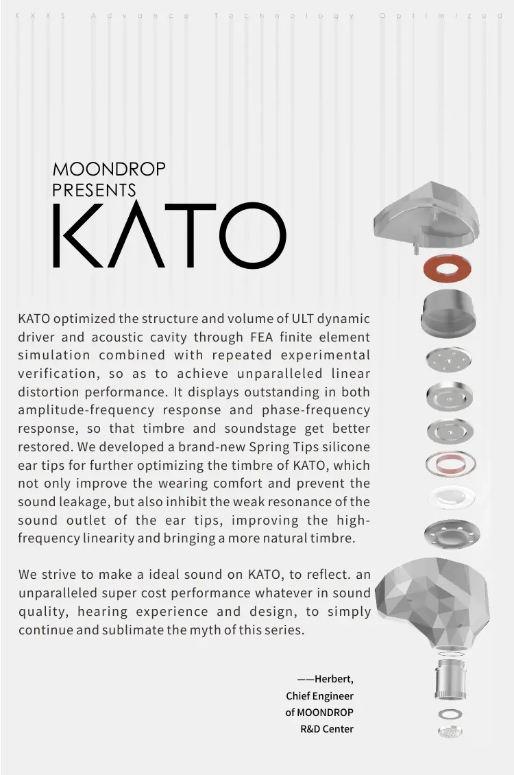 KATO optimised the structure and volume of ULT dynamic driver and acoustic cavity through FEA finite element simulation combined with repeated experimental verification, so as to achieve unparalleled linear distortion performance. It displays outstanding in both amplitude-frequency response and phase-frequency response, so that timbre and soundstage get better restored. We developed brand-new Spring Tips silicone ear tips for further optimising the timbre of KATO, which not only improve the wearing comfort and prevent the sound leakage, but also inhibit the weak resonance of the sound outlet of the ear tips, improving the high-frequency linearity and bringing a more natural timbre.