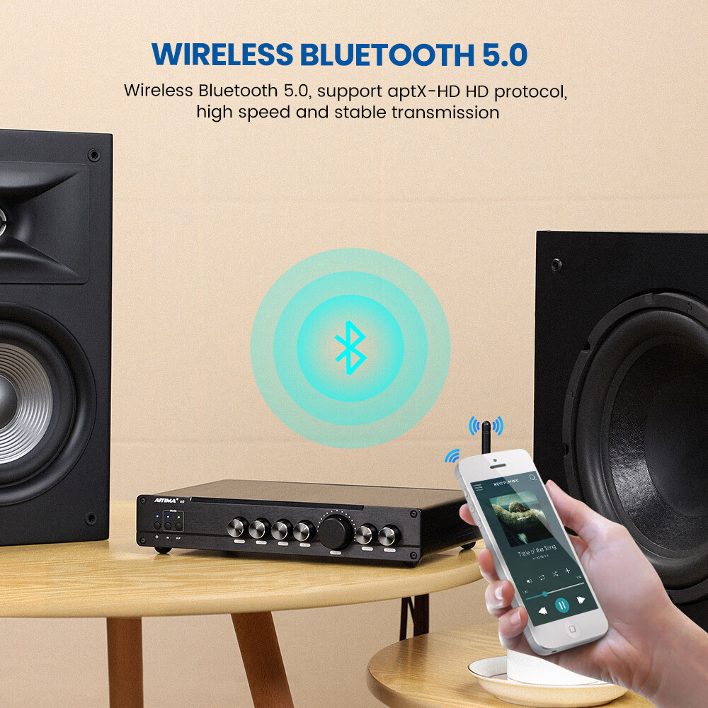 • 5.1 channel amp with professtional DSP decoding: A9 with built-in DSP decoding chip which applies professional algorithms and dynamic separation techniques, it auto allocates and simulates 2.1 and 5.1 channel and provide excellent smart noise reduction, precise sound positioning and stereo surrounded sense even though playing audio files of 2.0 channel.