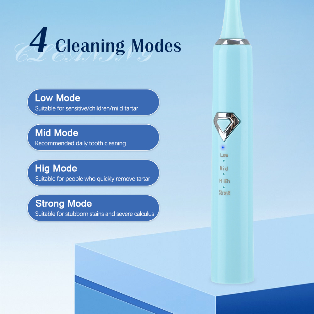 3.Four cleaning modes (low-grade, mid-grade, high-grade, strong) fully meet the oral cleaning needs of different groups of people and different dental conditions.