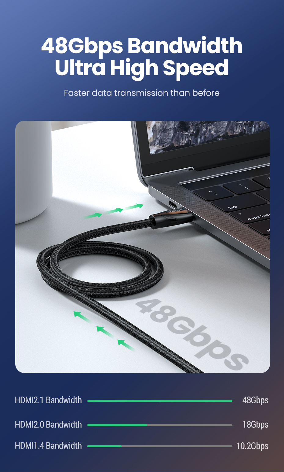 This 8k hdmi 2.1 version cable supports bandwidth up to 48Gbps, high-speed transmission without signal loss, much faster than hdmi 2.0 and hdmi 1.4.