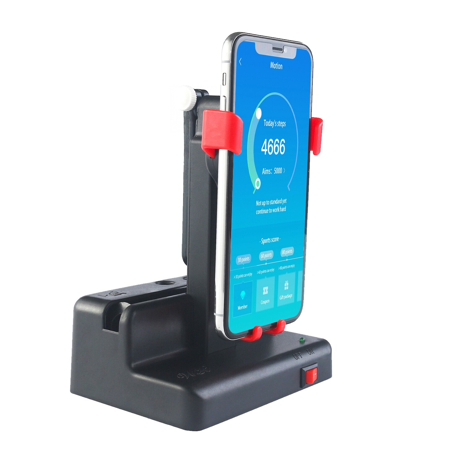 Features: 1. Left to right swing. More closely imitates walking. 2. No magnet. No more magnet interference on phone. 3. ON/OFF switch. Can be easily turned off and on. 4. More stable. Fixed with a three point arm. 5. 1 The number of steps per hour increased from 8,000 to 10,000. 6. With the metal wheel, you won't be annoyed by noise.