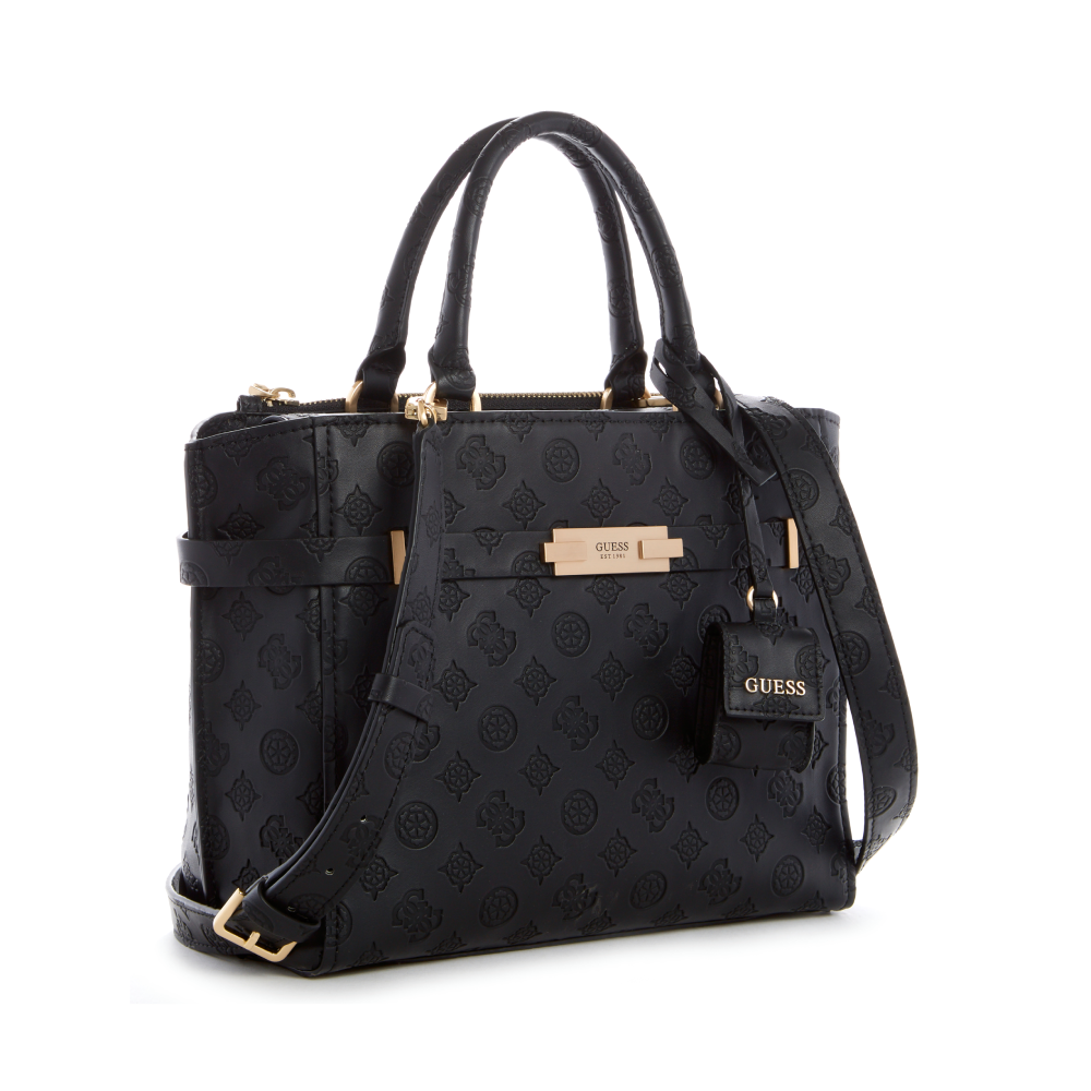 • This versatile satchel is structured with a divided interior with belted logo emblem at front and detachable crossbody strap.