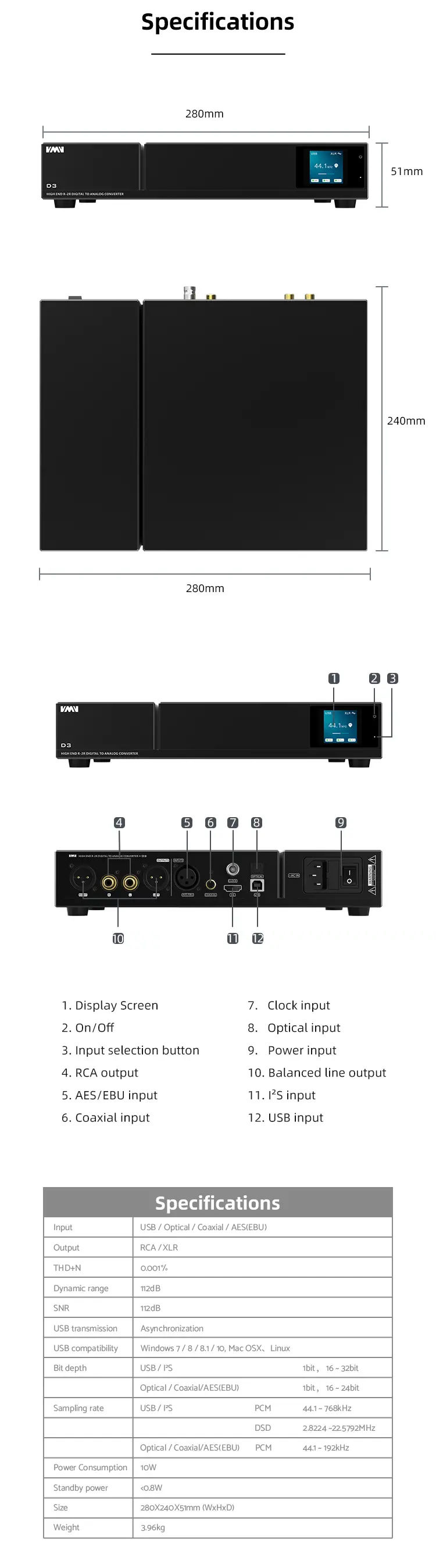 input : USB-B, optical, coax, AES, IIS, ext clock option (+remote control)