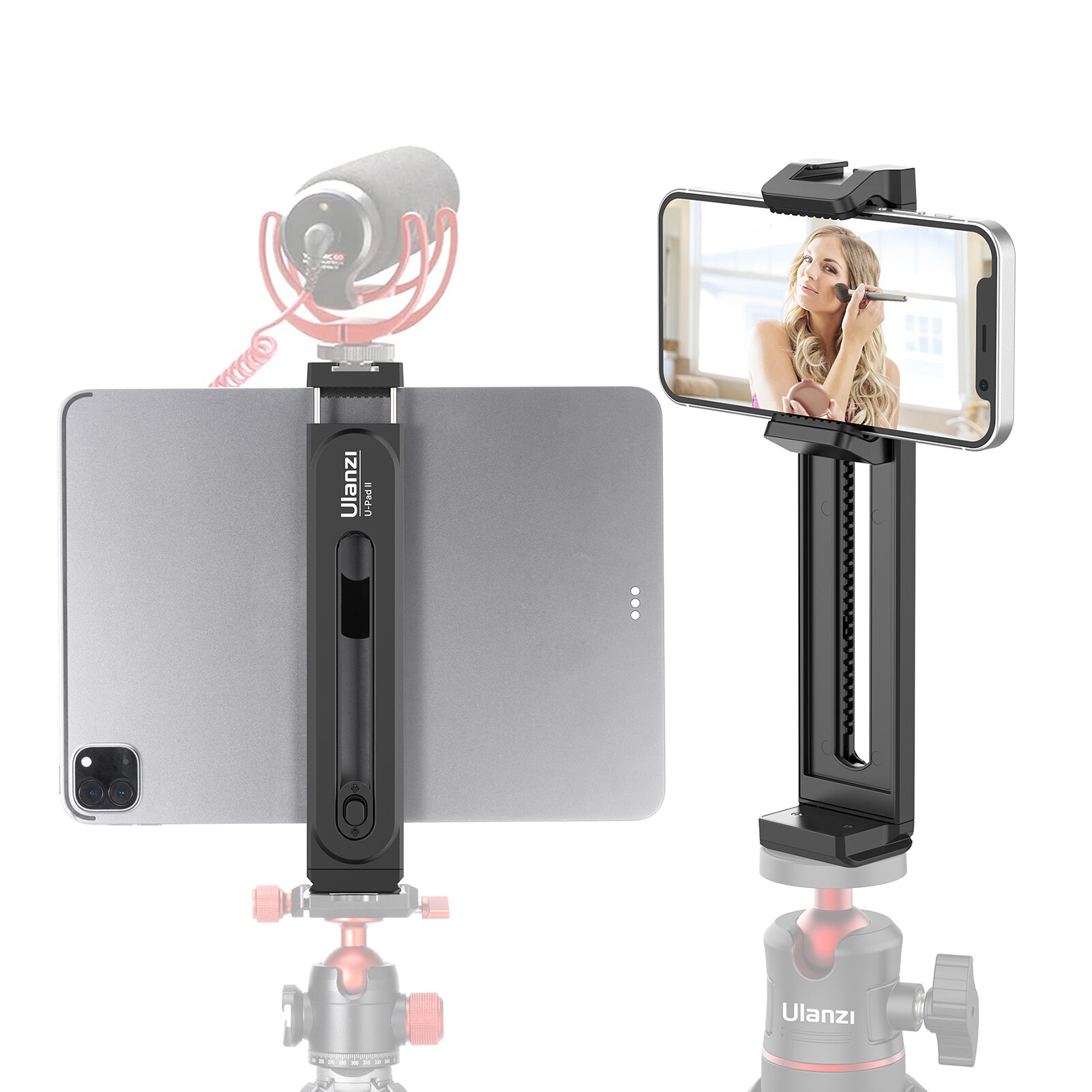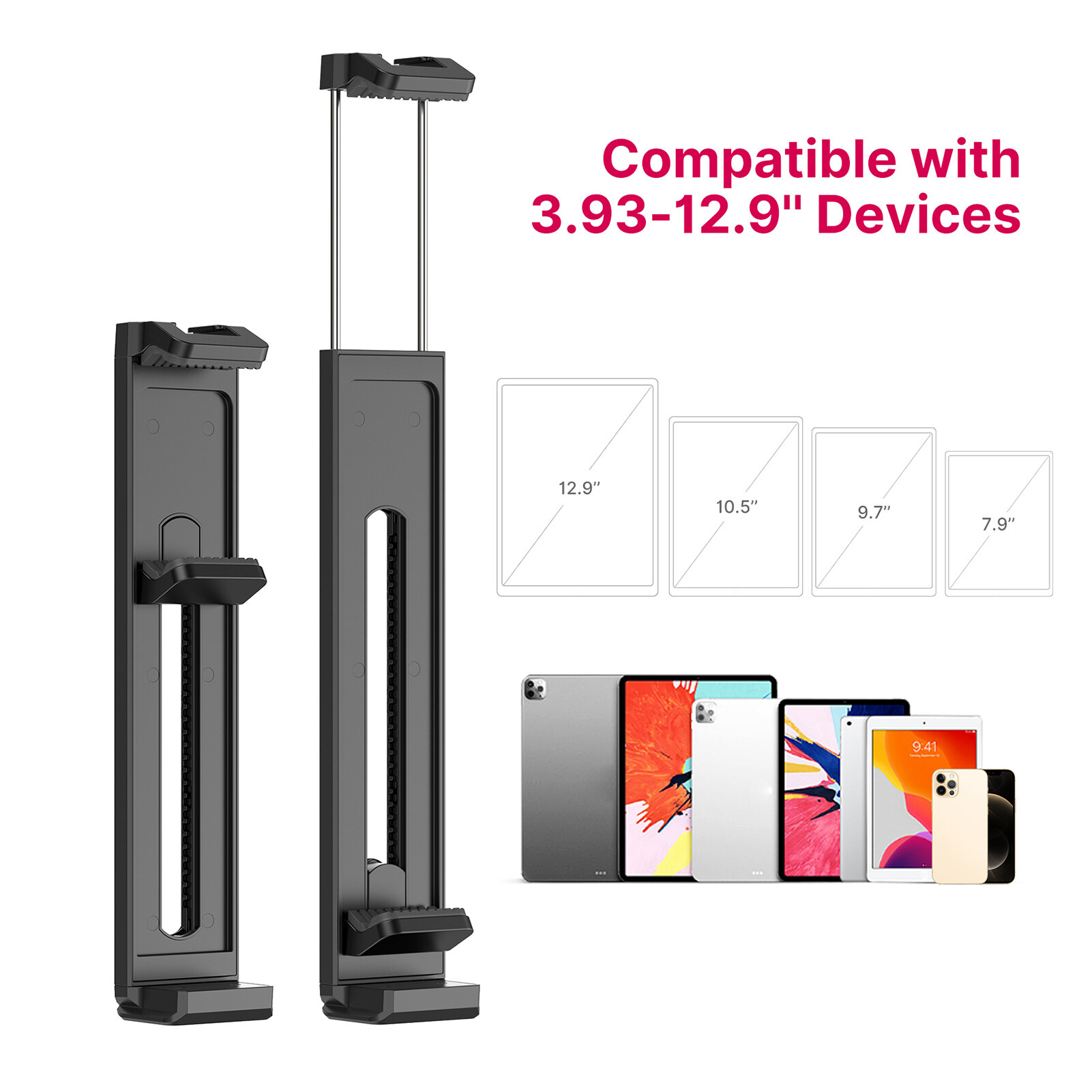 Universal Phone and Tablet Holder: Supports 6.5cm-26cm/ 2.55in-10.23in adjustable clamp width, compatible with all 3.93in - 12.9in smartphones and tablets.