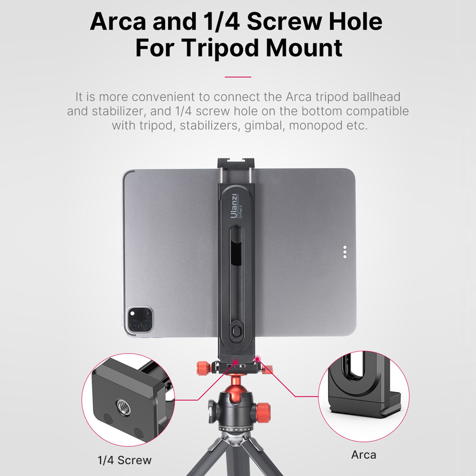 inch screw hole on the bottom for tripod, monopod or other bracket mounting, also can be connected to Arca tripod ballhead, more convenient to use.