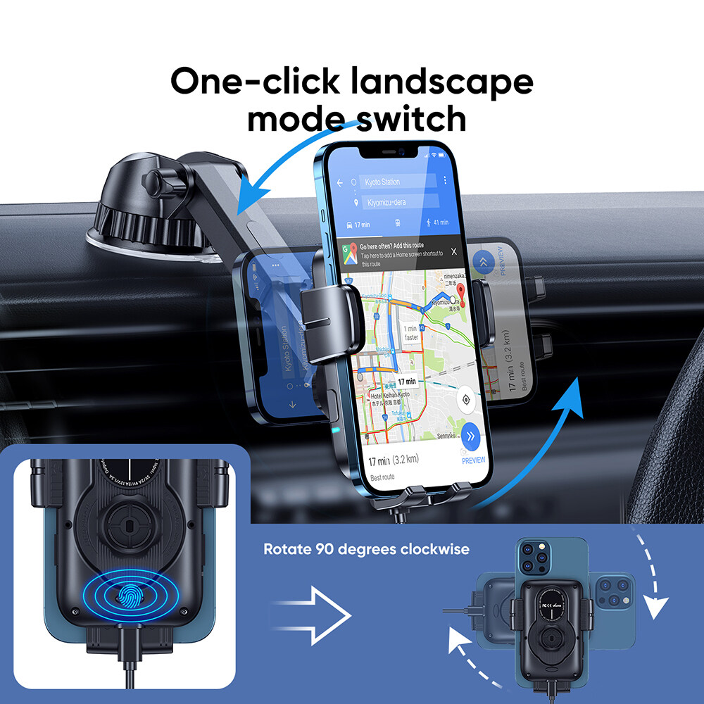 【Smart Automatic Sensor Design】-- Automatic opening and clamping design which can be operated with one hand and make everything easier and safer. Just place your phone inside the holder, the clamps will close and provide a strong stable hold. A gentle touch on any sides of the quick release buttons, the holder will rotate to horizontal screen. When your phone is fully charged, the wireless car charger will automatically power off and last the life of battery of your phone.