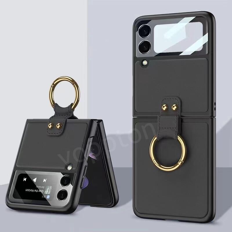 [ Ring+Tempered Glass+ Chain ]KISSCASE for Samsung Z Flip 4 Flip3 Leather Case 360 Full Protection Tempered Glass Phone Case for Samsung Galaxy Z Flip4 Flip3 Phone Case