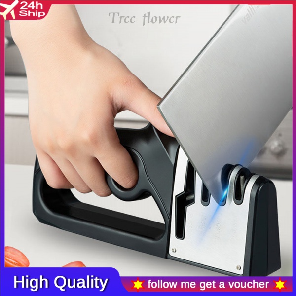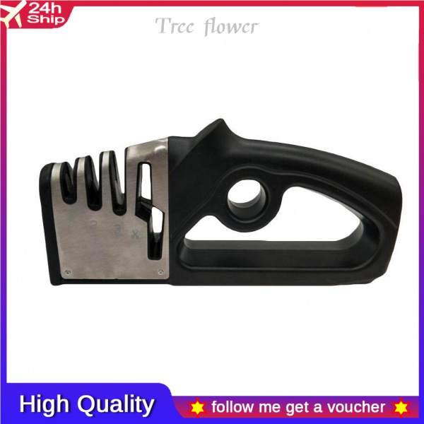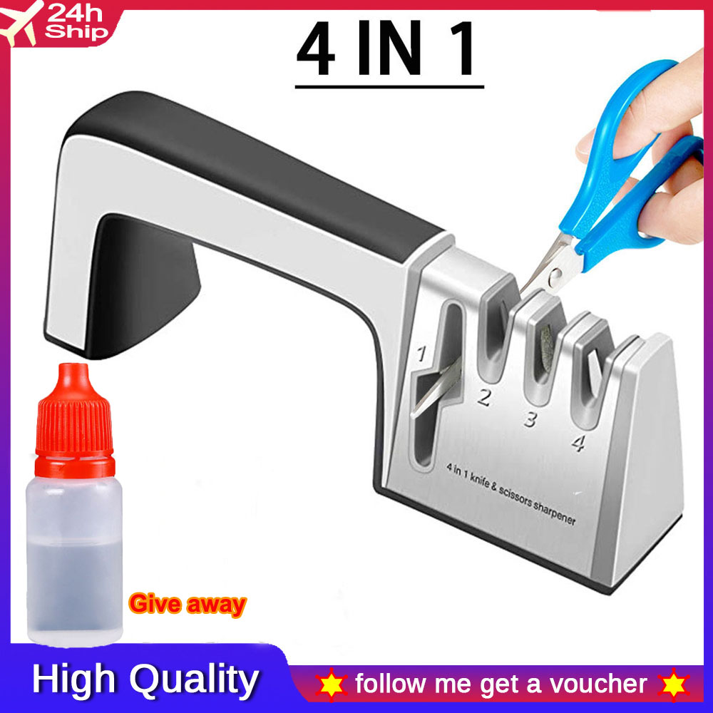 * Material: High grade materials ensure durability.4-slots knife sharpener: With our incredible 4-slot system, including diamond sharpening rod for coarse, ceramic sharpening rod for fine sharpening and polish, tungsten sharpening rod for blunt blades and scissors sharpening rod.