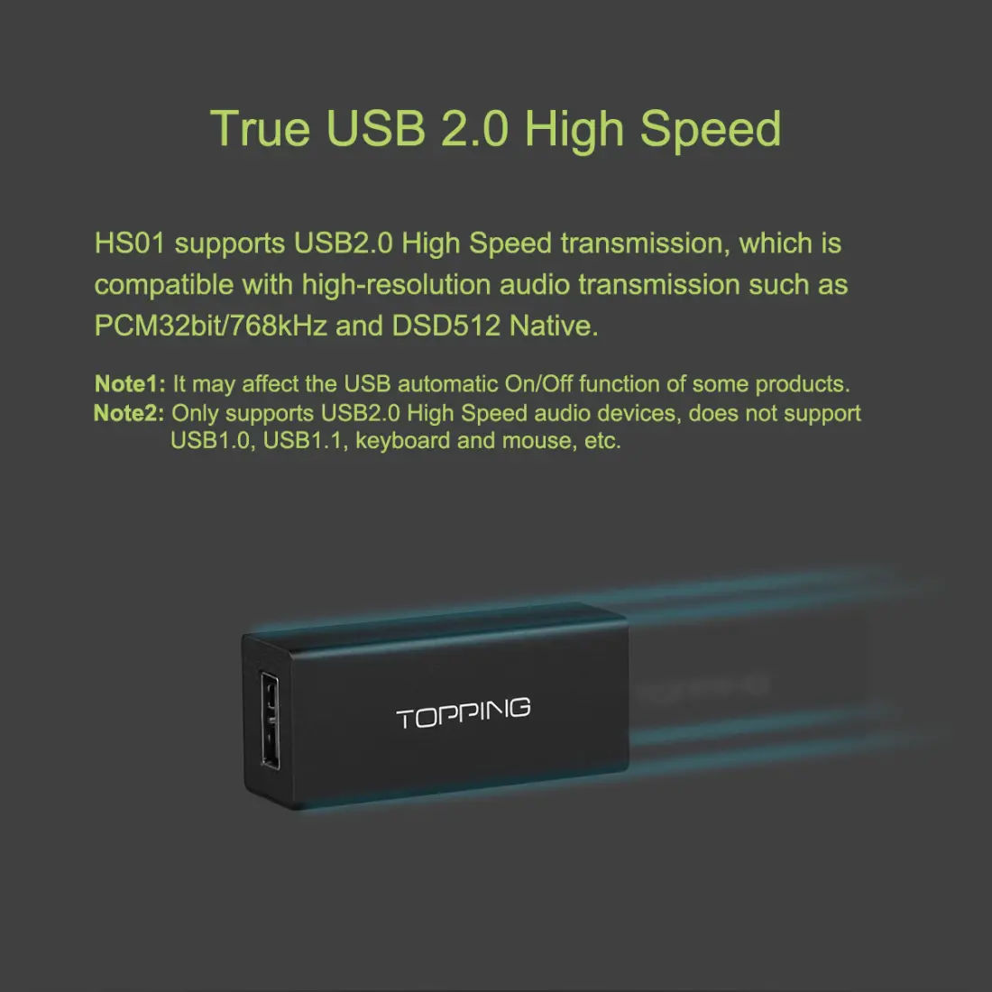 HS01 supports USB2.0 High-Speed transmission, which is compatible with high-resolution audio transmissions such as PCM32bit/768kHz and DSD512 Native.
