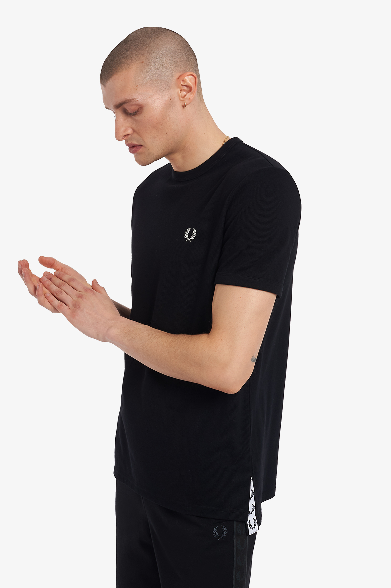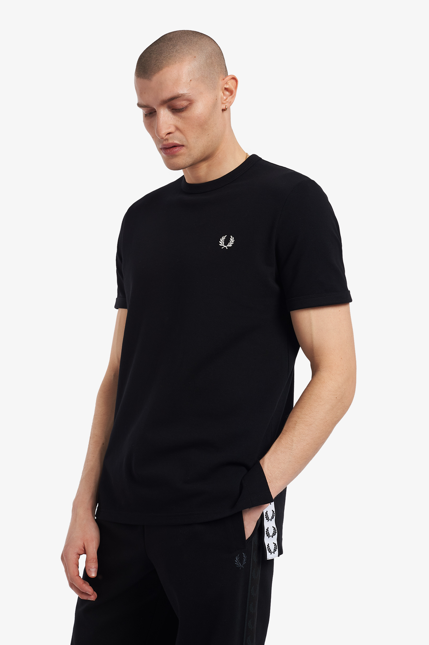 First used on our tricot track jackets in the 1970s, our branded track tape has become something of a signature detail. Designed with our graphic tape stitched inside the side vents, our T-shirt offers a subtle take on the familiar detail. Very very Fred Perry.