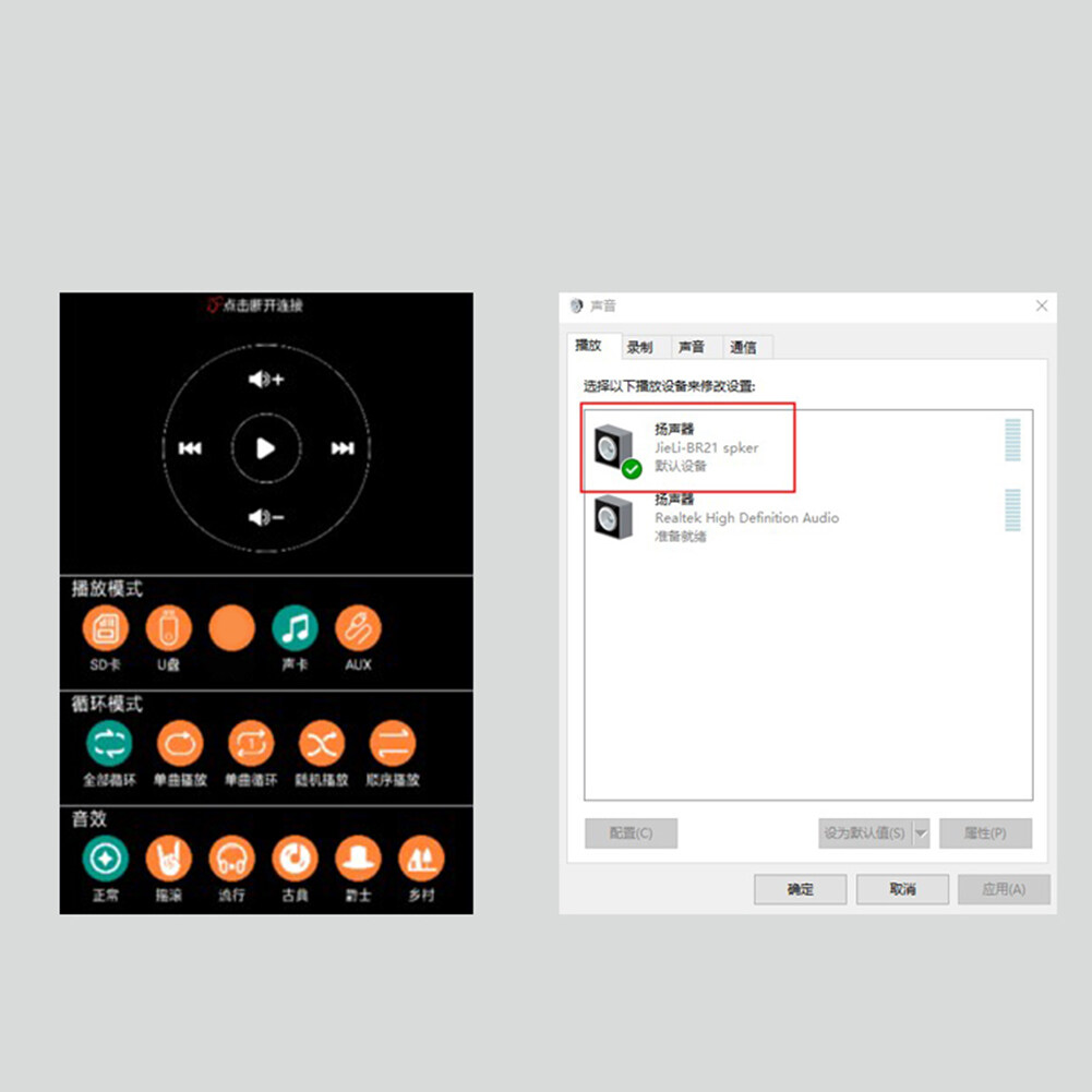 Support computer sound card function. The output signal with better sound quality than the computer can be played by the speaker. Connect the Bluetooth-compatible board card to the computer with the data line, open the APP, and click "Sound card" to switch the switch is completed with prompt sound playing. Turn on the computer player software to play music.