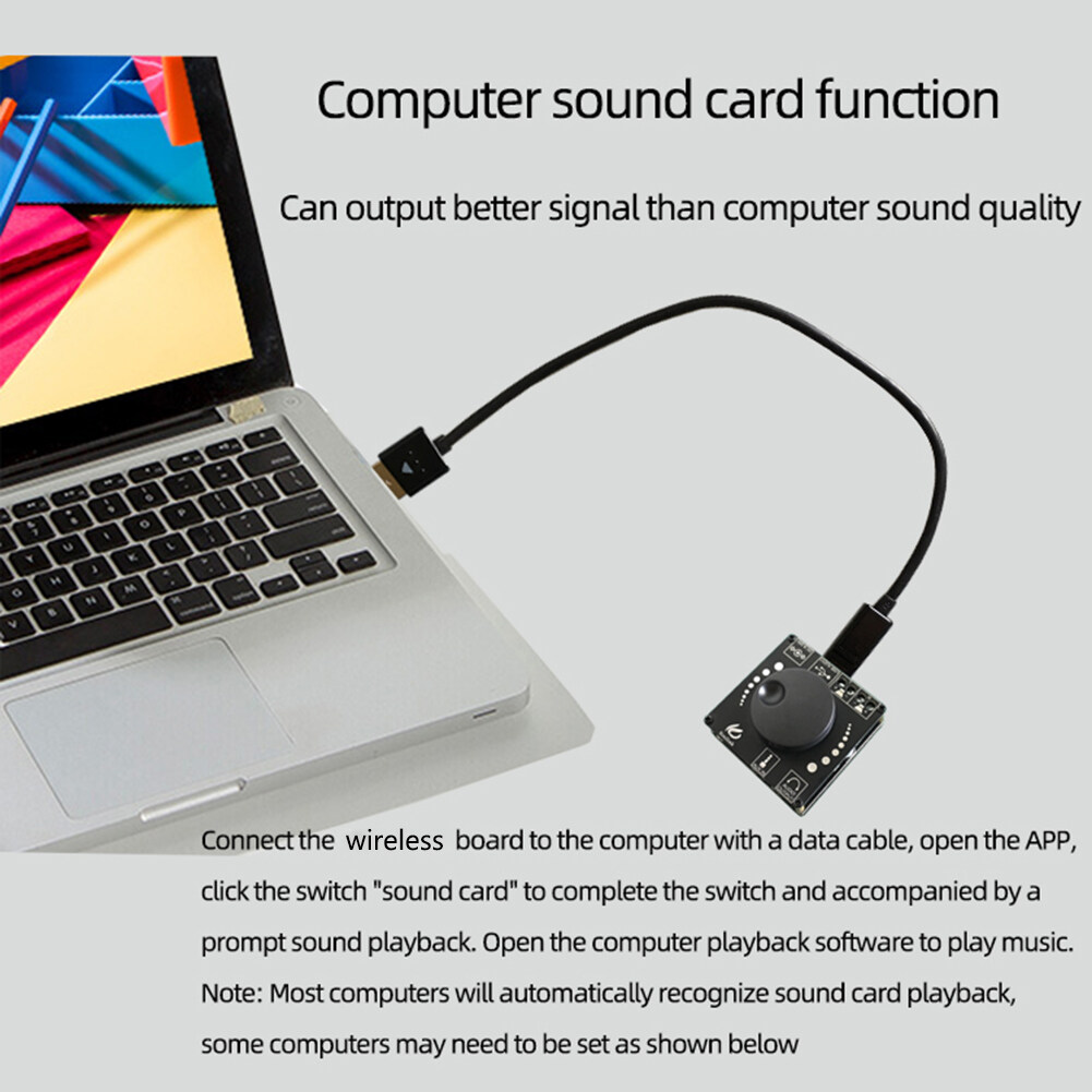 Support computer sound card function. The output signal with better sound quality than the computer can be played by the speaker. Connect the Bluetooth-compatible board card to the computer with the data line, open the APP, and click "Sound card" to switch the switch is completed with prompt sound playing. Turn on the computer player software to play music.