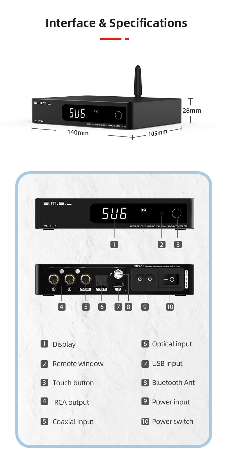 >In order to ensure quality performance, S.M.S.L has designed the SU-6 USB DAC with premium audio components on the motherboard. It features 4 high-grade OPA1612 OPAMPs, a specially-designed low-noise power supply, Qualcomm's latest Bluetooth chip, and many more high-quality components.