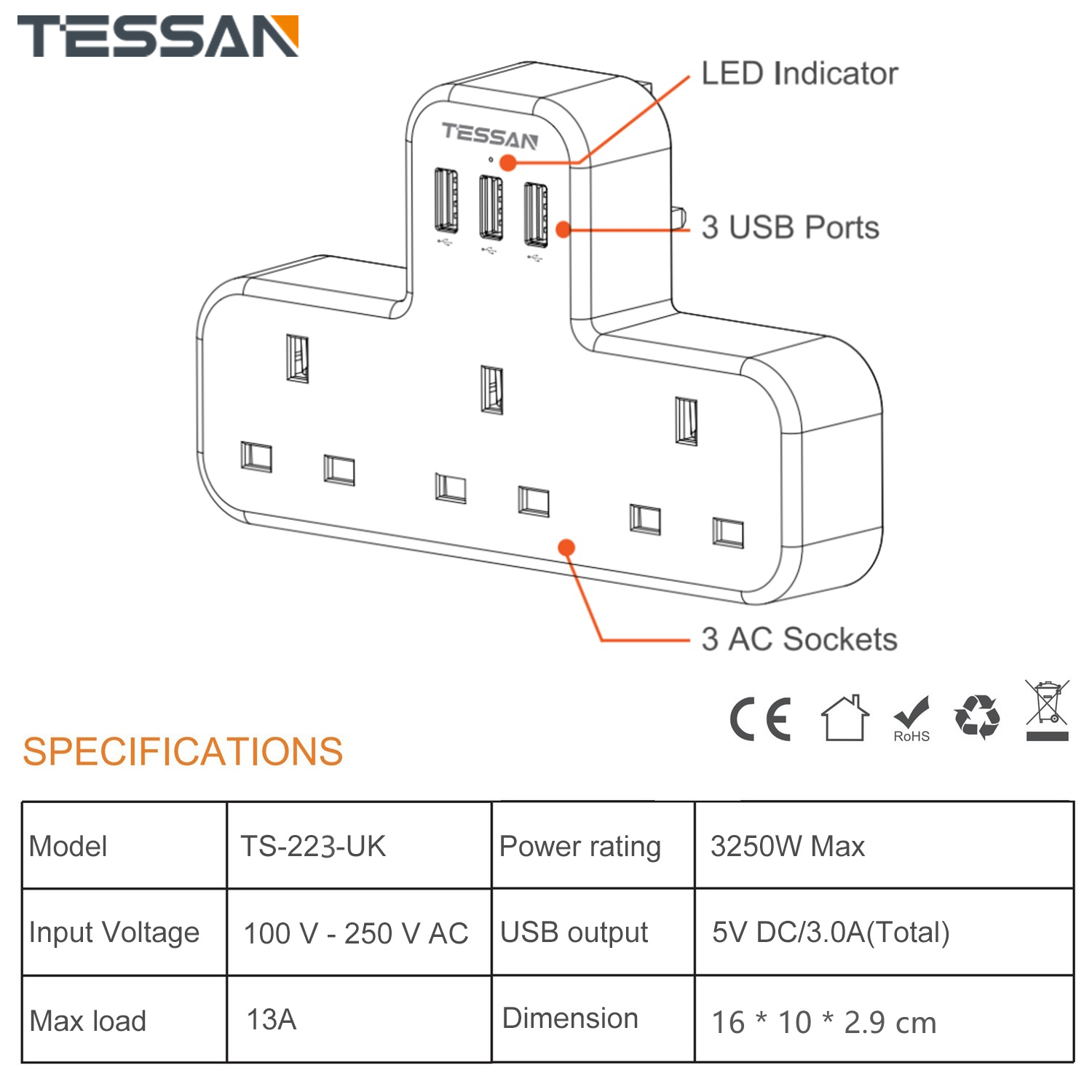 - Multi Plug Extension: This extension plug extends a wall socket to 2 AC outlets and 3 USB slots, which can charge 5 devices at the same time. The max output from USB port is 15W (5V3A) and AC outlet is 3250W (250V/13A), ideal for charging most office and household appliances