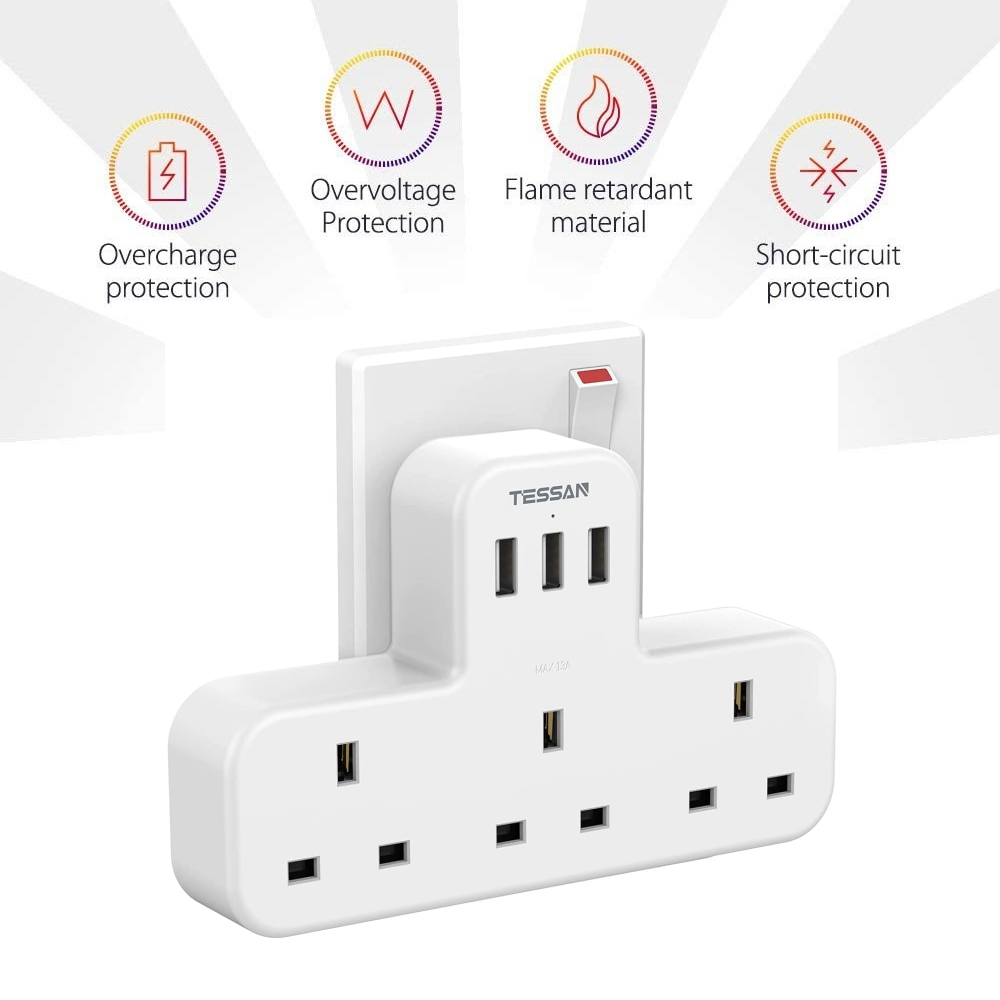 - Multi Plug Adaptor: This triple plug adapter features 3 AC outlets and 3 USB ports, which is ideal for charging indoor without bulky extension cords. 1 plug adapter for 6 devices. Max capacity up to 3250W (250V/13A)