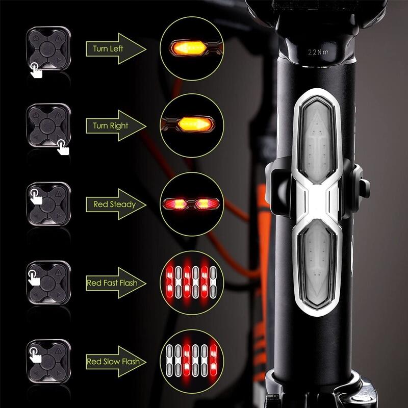 Versatile with multiple modes ---- 3 modes as rear light: steady, flash and strobe; 2 modes as bike turn signal: turn left and turn right(After 15 seconds, it automatically returns to the previous mode.); 1 mode as brake lamp: steady on high brightness, activated by the remote.
