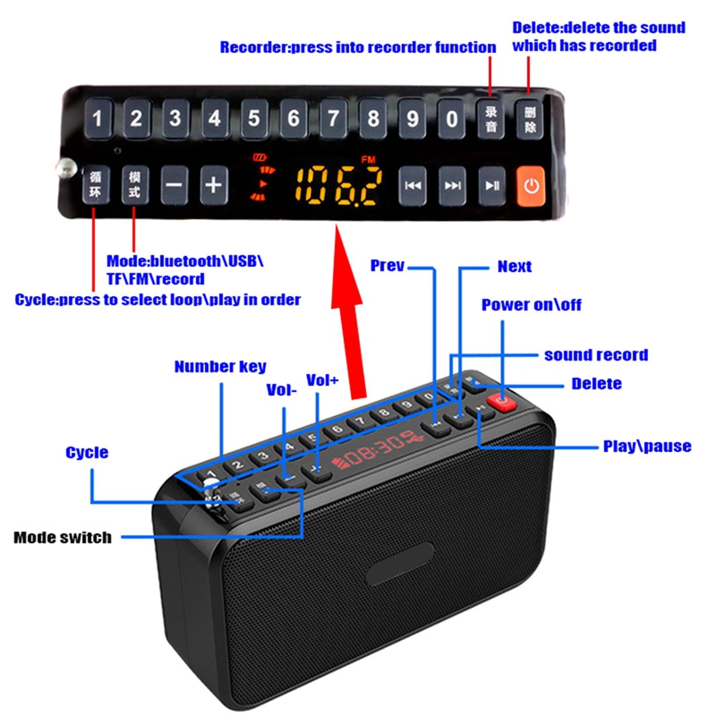 Function: Bluetooth 5.0/Hands-free calll/Sound recorder/FM radio /TF card play /USB disk play
