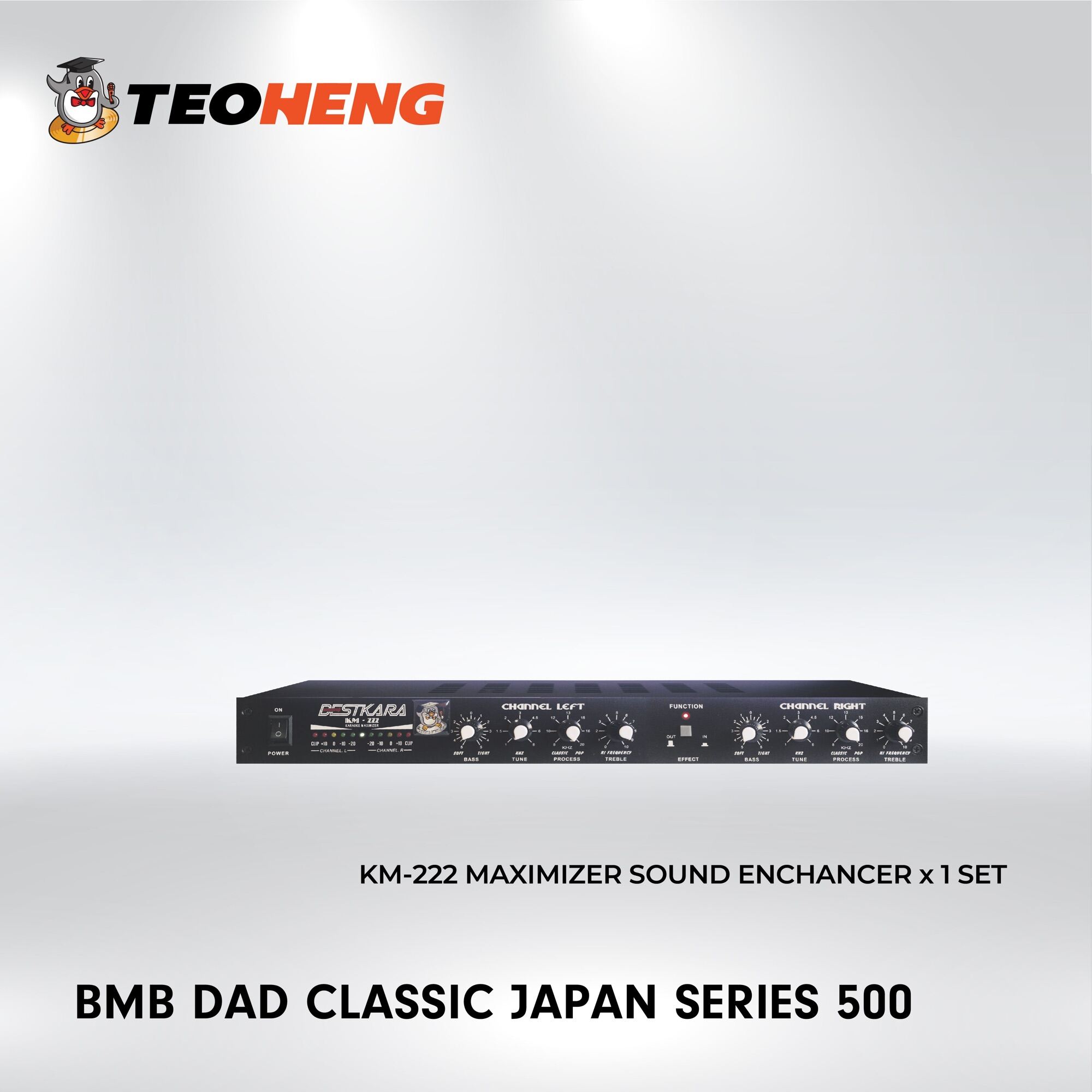 WASUKA KM-222 PRO SOUND ENHANCEMENT FOR KARAOKE,Audio Frequency input: Connecting ends : XLR (balance) and 1/4 " TRS jack (unbalance)impedance : 50KΩ (balance) 25kΩ (unbalanced), Maximum Exposure: +21dB (balance) and (unbalance), Repellent Ratio : 40dB > 50dB@1kHzAudio Frequency output: Connecting Ends : XLR (balanced) and 1/4" TRS jack ( Unbalance), Impedance :50KΩ (balance) 25KΩ (Unbalance), Maximum Exposure : +21dB (Balance) and (Unbalance)System Specs: Bandwith : 20Hz to 20kHz + 0/-0.5dB, Frequency Response : 0.4Hz to 220kHz + 0/-3dB, Noise : > -95dB, Unweighted