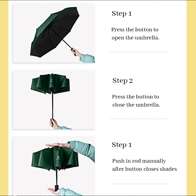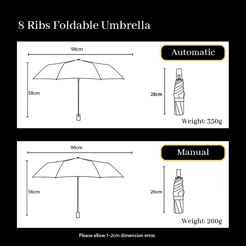 ☂ Anti-UV Black Coating Umbrella - AutomaticFeatures:✅ Automatic open and close - equipped with one button which can quickly open or close umbrella when pressed✅ Compact & portable - lightweight at 330g - 350g and easily tucked into handbag/backpack✅ Waterproof coating - quick dry with excellent water repellency✅ UV Protection - inner blackout coating effectively block out harmful rays from hot sun✅ Windproof - 8 bones with strong wind resistance. No more awkward umbrella flying around during sudden strong gust of wind✅ Handle - Anti-slip handle can comfortably hold for long period of time☂ Anti-UV Black Coating Umbrella - ManualFeatures:✅ Compact & portable - lightweight at 260g-280g and easily tucked into handbag/backpack✅ Waterproof coating - quick dry with excellent water repellency✅ UV Protection - inner blackout coating effectively block out harmful rays from hot sun✅ Windproof - 8 bones with strong wind resistance. No more awkward umbrella flying around during sudden strong gust of wind✅ Handle - Anti-slip handle can comfortably hold for long period of time
