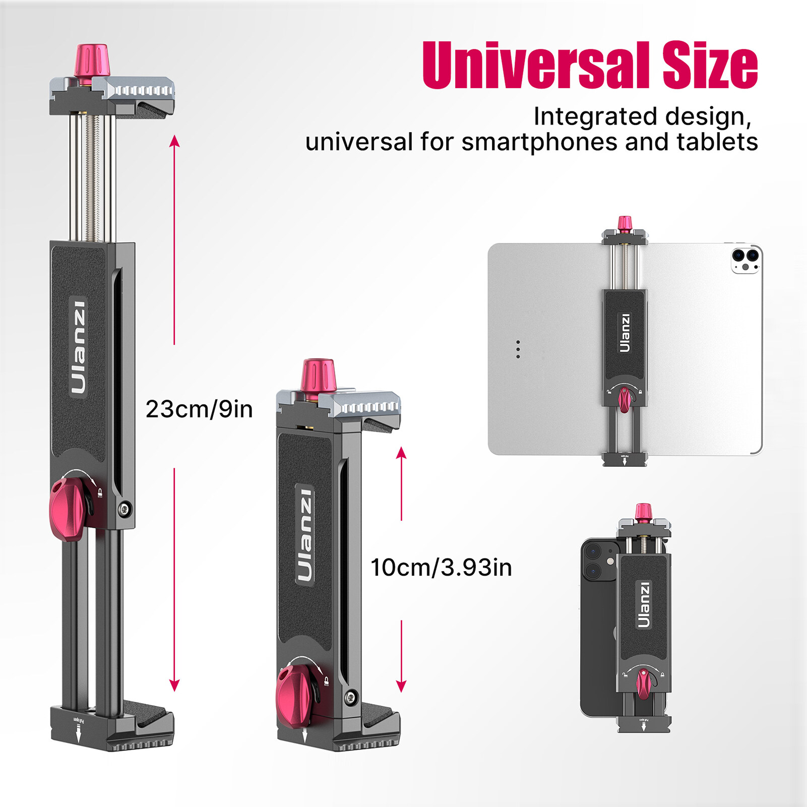 Supports 10cm-23cm/ 3.93in-9in adjustable clamp width, compatible with all 4.7in - 12.9in smartphones and tablets.