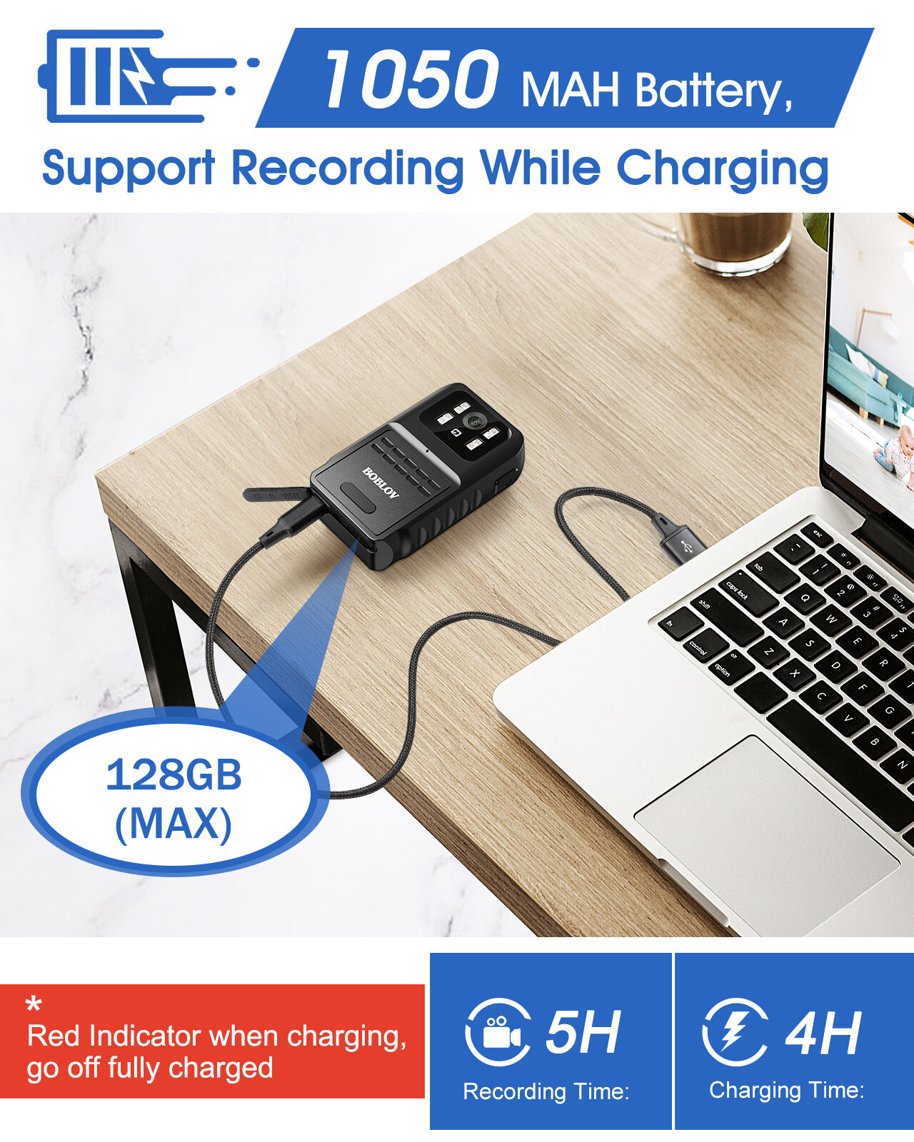 Built-in 1050 MAH battery, recorder supports about 5 hours recording(WiFi&IR Off) and use when charging.