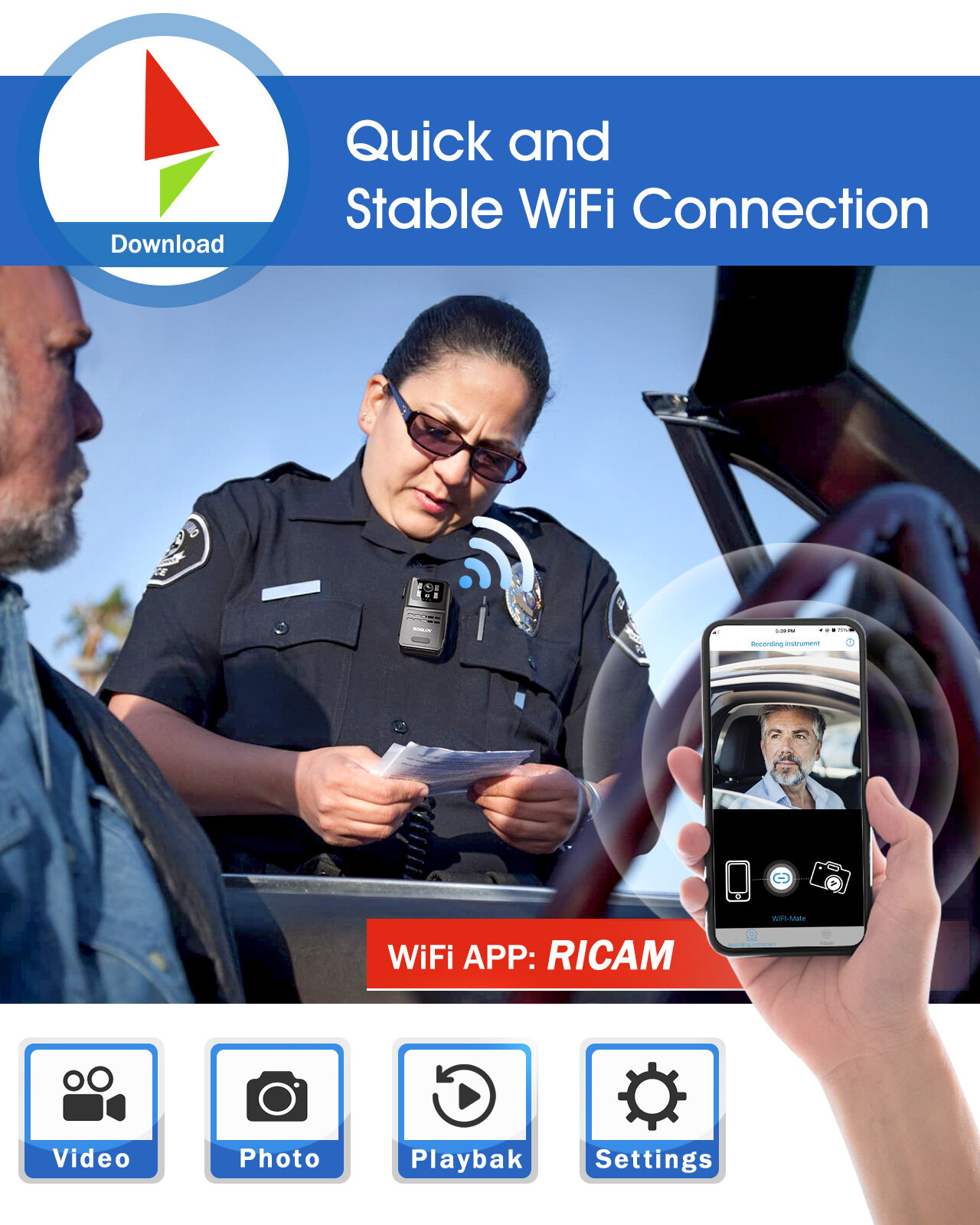 Features 1080P/30fps, the mini body camera could connect to mobile phone app to playback/download/delete videos.