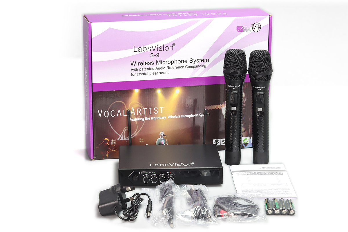 1 x S-9 Karaoke Mixer, 2 x Wireless Microphones, 2 x Microphone Anti-Slip Rubber Rings, 2 x Microphone Sponge Covers, Power Adapter, AV Cable, User Guide.
