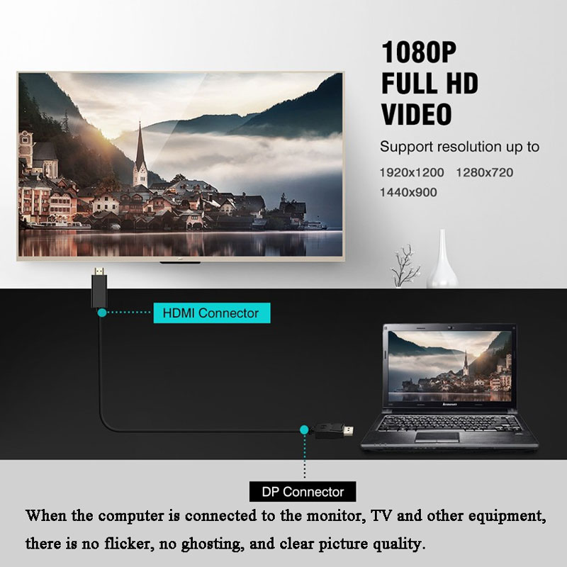 Compliant with HDMI 1.3a specification up to 2.25Gbps.PC:VGA, SVGA, VGA, SXGA, UXGA and UXGA.HDTV: 480i, 576i, 480p, 576p, 1080i, and 1080Length: 1.8m (6ft)Connect DisplayPort-equipped computers/devices to HDMI-enabled televisionsSupports both Audio and VideoNothing to install just plug and playPackage Included:1 x DP Cable
