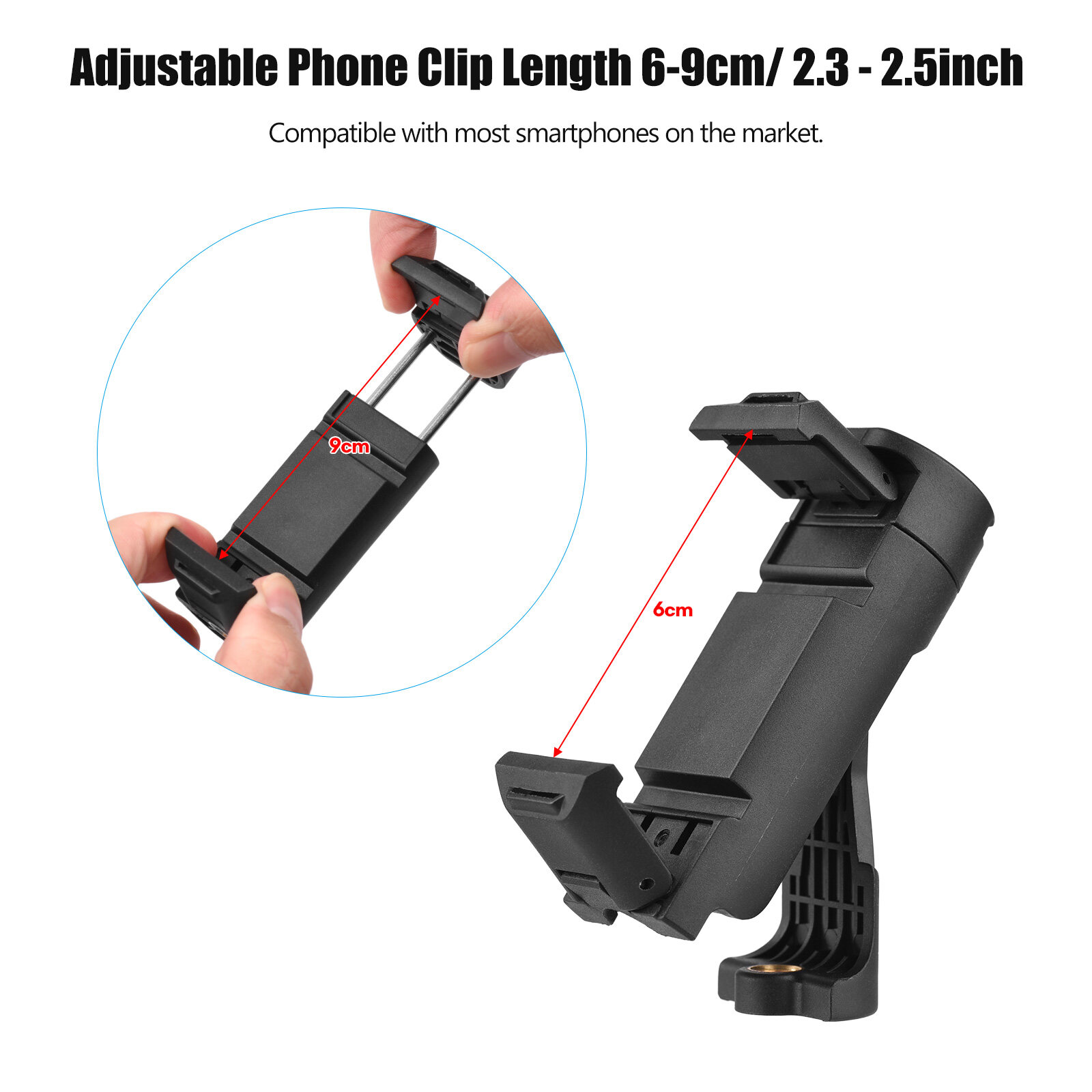 Features: Universal phone clip, 6-9cm/ 2.3-2.5inch adjustable length, compatible with most smartphones on the market.