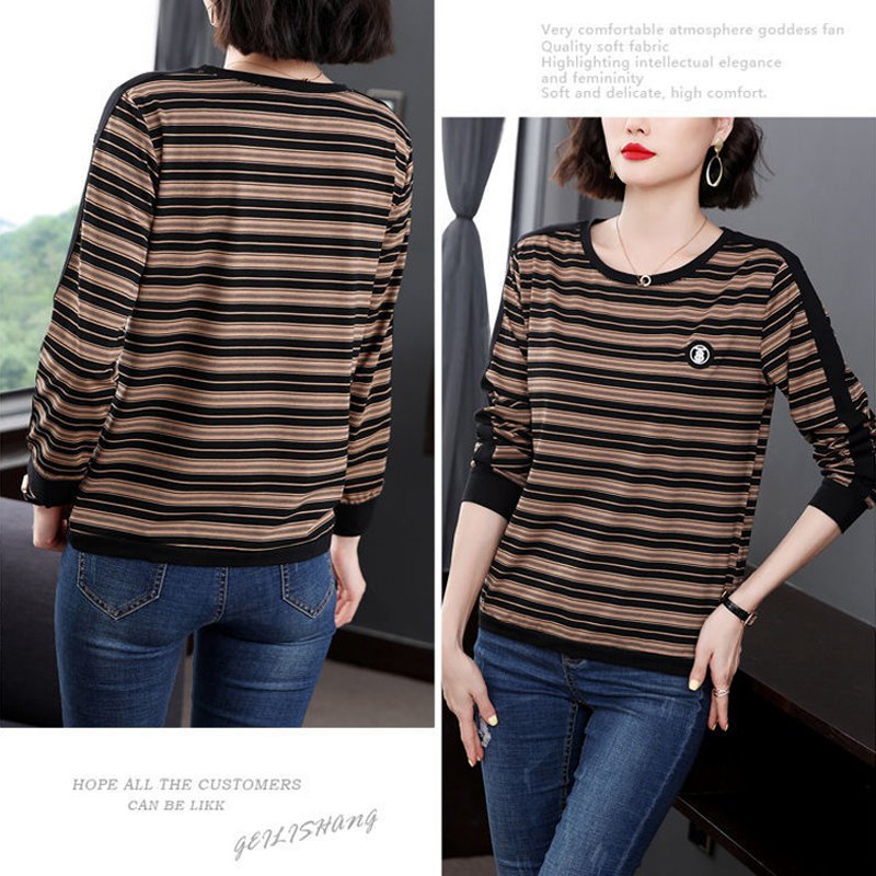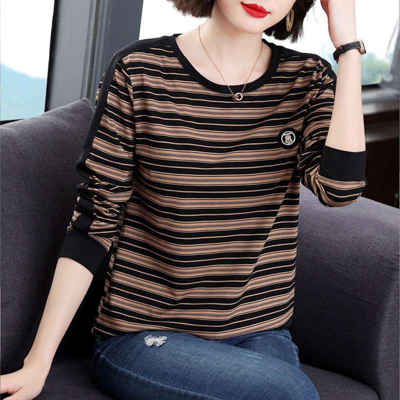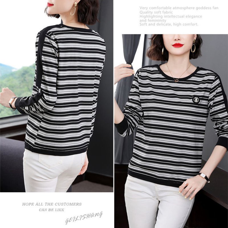 INWPLLR Spring Women's T-shirts Stripe Long Sleeve Tops All-match O-Neck Large Size Tops Tee Female
