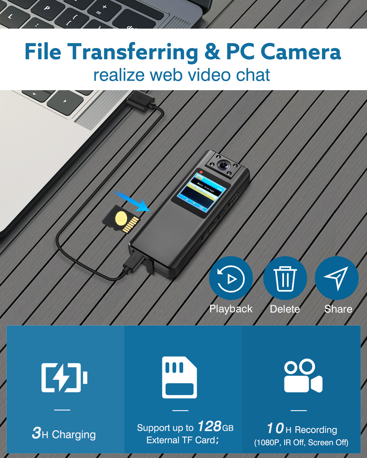 • Built-in 2200MAH Battery support record 10 hours of the video after fully charged (in 1080P, IR Off, Screen Off). Comes with optional memory card.
