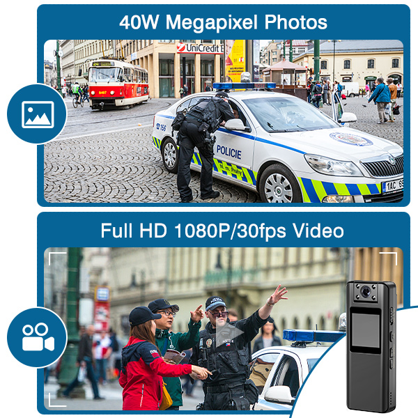 • A 1.3 inch LCD screen works for real-time viewing and managing the recorded videos/audios/photos on the mini body camera as you want, anytime anyplace.