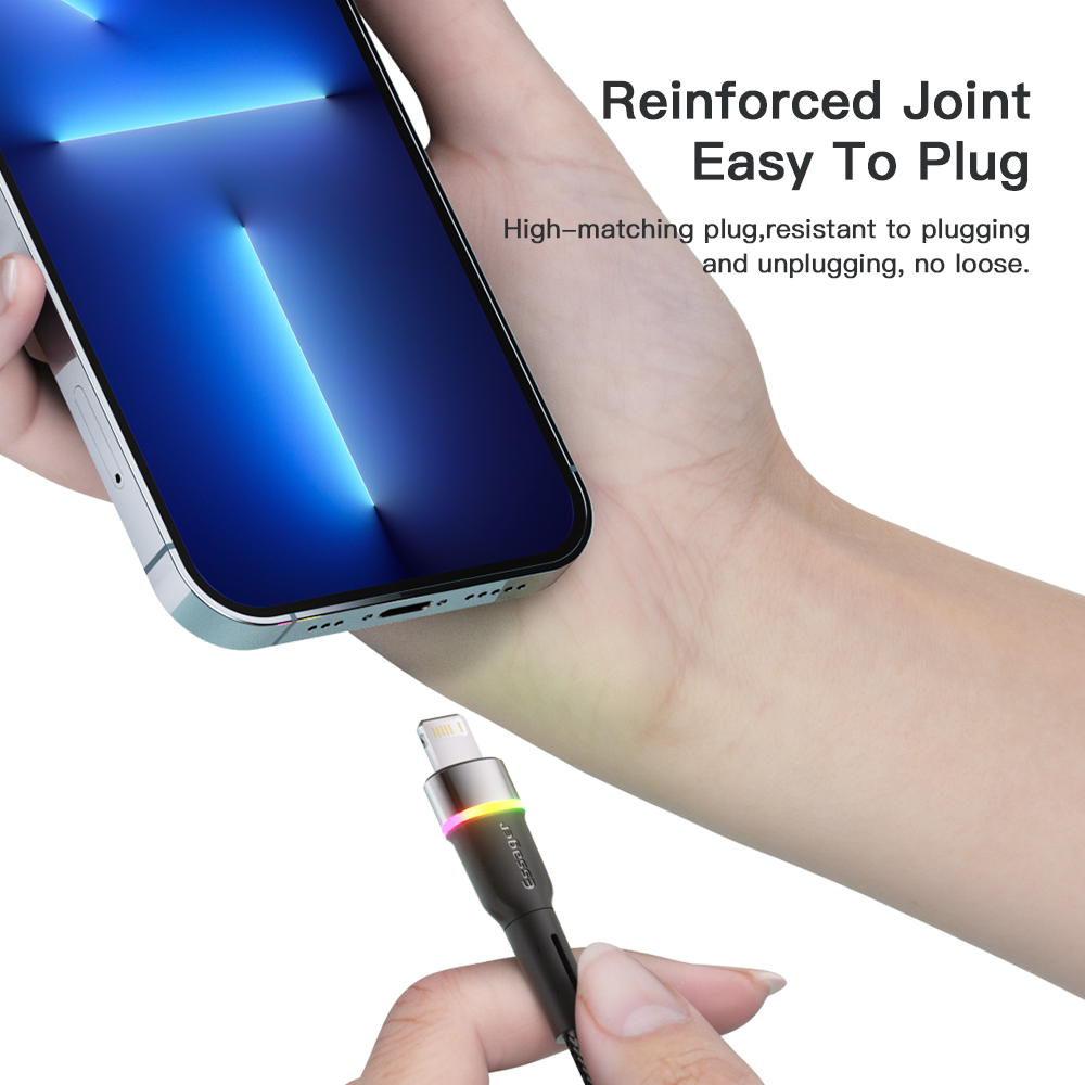 Brand: Essager Product name: Essager colorful colorful lights data cable A-L Material: aluminum alloy, braided Interface Specifications: Lightning Color: black, blue, purple