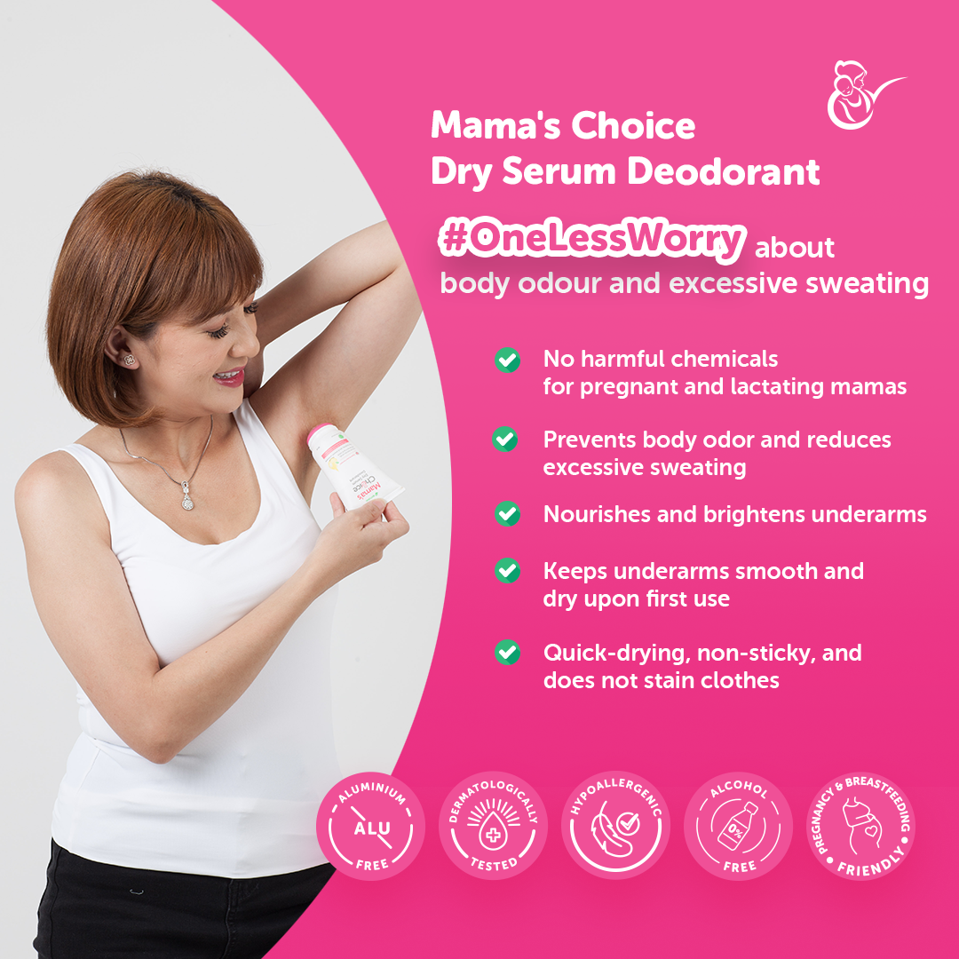 Did you know that normal deodorants are often formulated with aluminum, which may not be the best choice for pregnant or breastfeeding mamas? Mama’s Choice Dry Serum Deodorant brightens, nourishes, and helps control excessive sweating without all the harmful ingredients.
