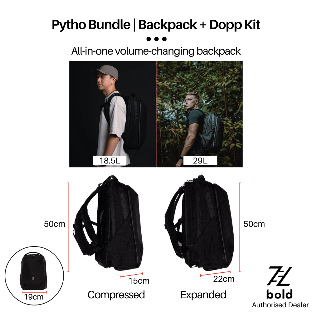 Pytho is the ultra user-friendly, volume-changing backpack with patent-pending compression straps that optimizes packing space in your everyday carry. Pytho is designed to meet the needs of go-getting active urbanites, going from the gym to the workspace and to the weekend staycation - all in one minimal backpack.