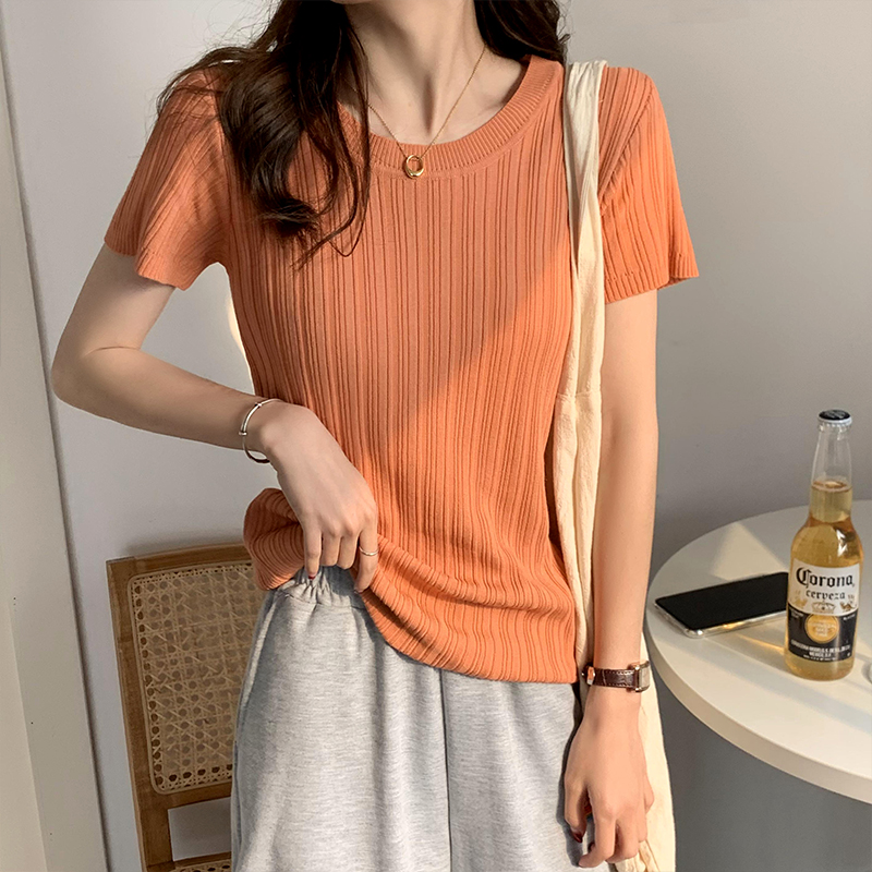 INWPLLR Ice Silk Knitted T-shirts Women Short Sleeved Square-neck Tops Summer All-match Simple Solid Tshirt Ladies