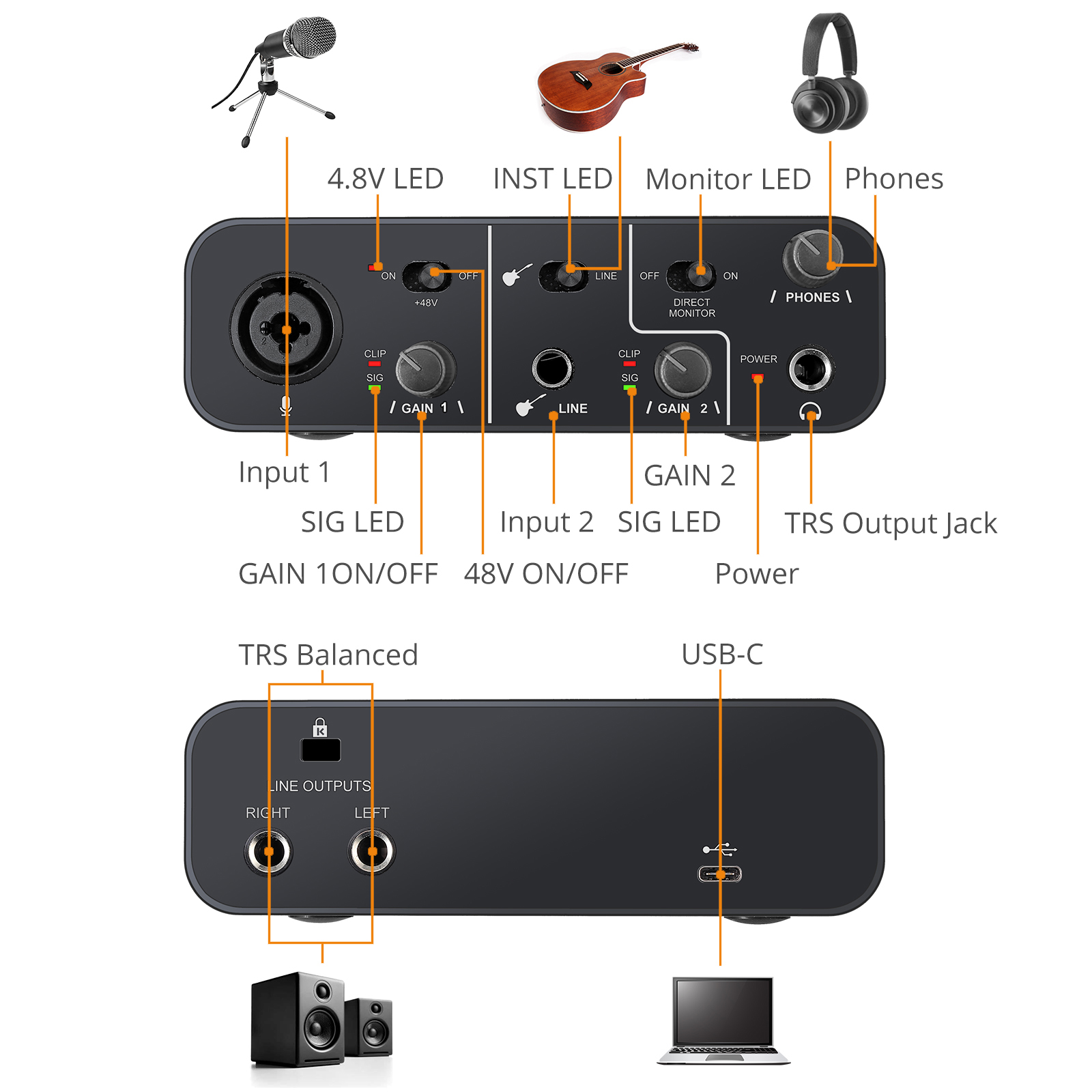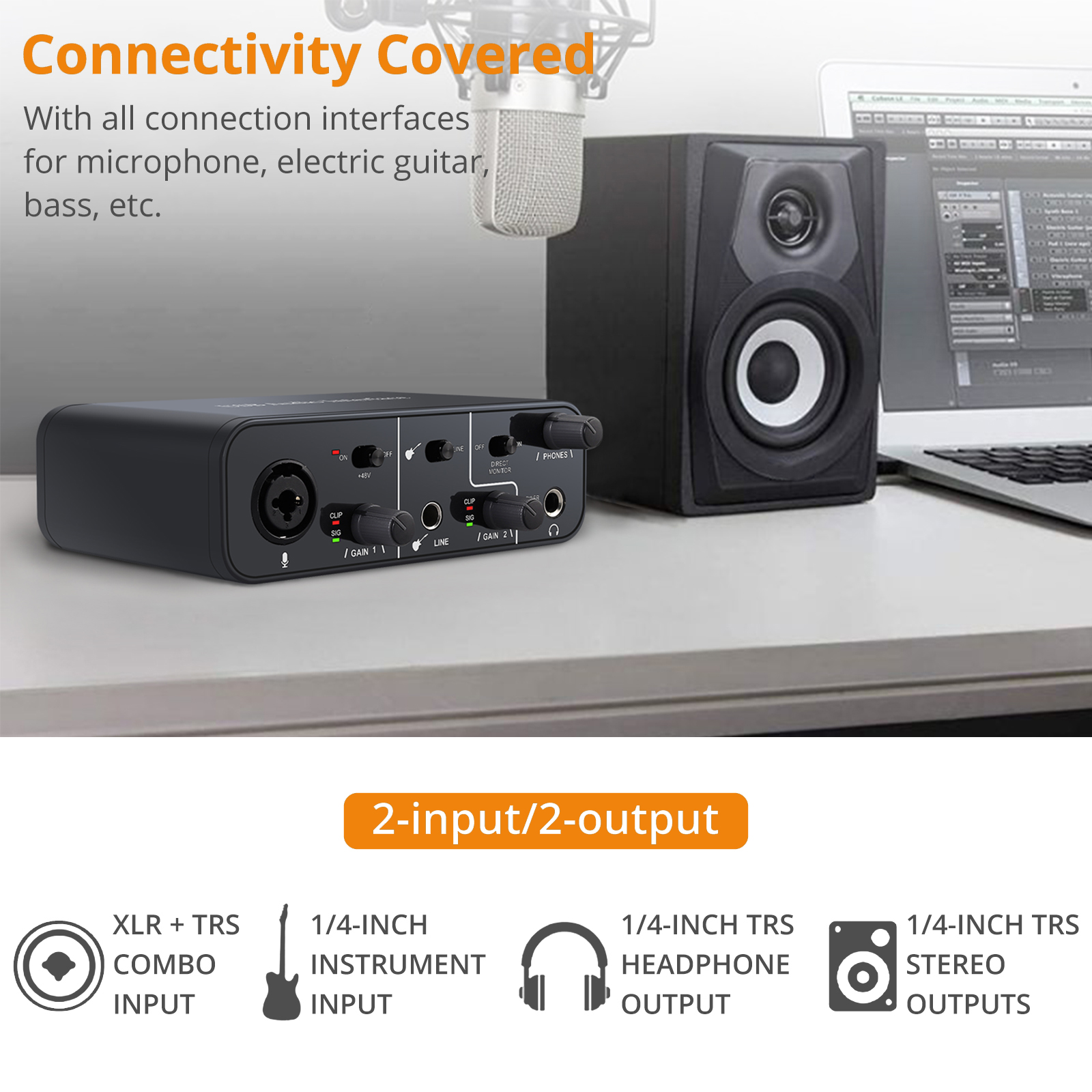 You can use this product to record high-quality audio on your computer. Not only record the human voice through the microphone input port; also can record the instrument sound of an electric guitar or bass through the instrument input port of the 1/4 inch (6.35 mm) jack; at the same time, you can connect the physical output to the speaker, active monitors, headphones or any other audio equipment for real-time monitoring.