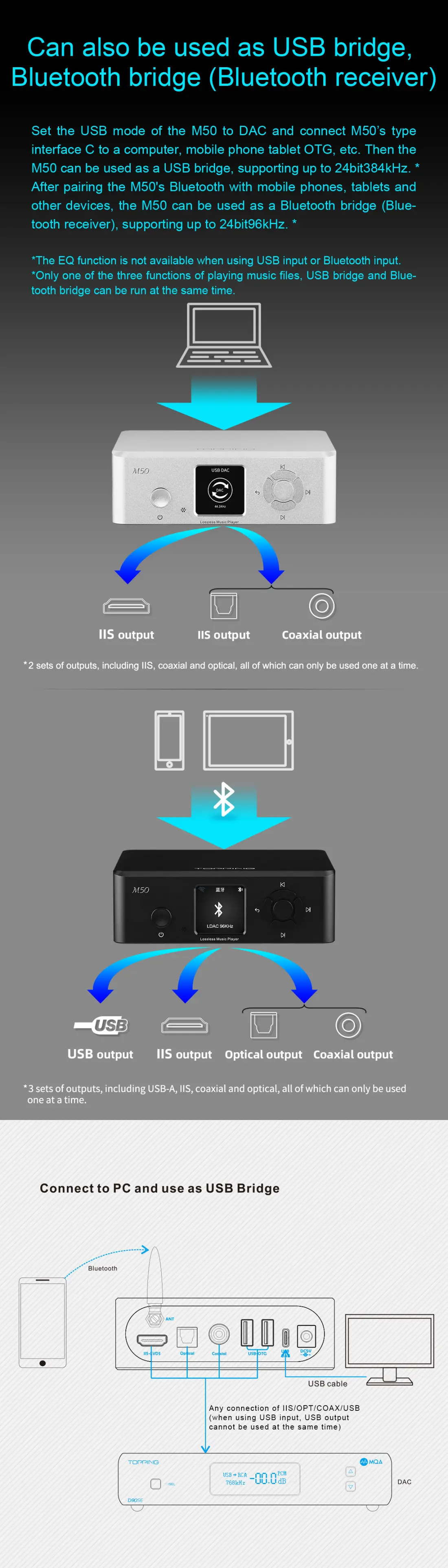Topping M50 is a premium desktop digital audio player with 10-band EQ support along with Apple Airplay and DLNA connectivity. Topping M50 supports USB OTG function, and has a microSD and Flash disk support(up to 256GB capacity). Topping also features advanced two-way high-resolution Bluetooth functionality on the M50. As for outputs, it has Coaxial, Optical, and IIS digital outputs. M50 converts digitalized music files into a digital audio signal and output it for pure digital conversion via high-quality DACs in your chain. Topping M50 is compatible with multiple file systems with support for up to 24Bit/384kHz PCM and native DSD256 reading.