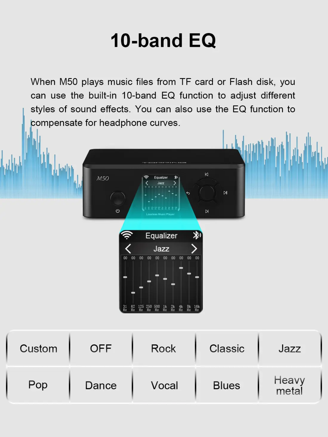 Topping M50 is a premium desktop digital audio player with 10-band EQ support along with Apple Airplay and DLNA connectivity. Topping M50 supports USB OTG function, and has a microSD and Flash disk support(up to 256GB capacity). Topping also features advanced two-way high-resolution Bluetooth functionality on the M50. As for outputs, it has Coaxial, Optical, and IIS digital outputs. M50 converts digitalized music files into a digital audio signal and output it for pure digital conversion via high-quality DACs in your chain. Topping M50 is compatible with multiple file systems with support for up to 24Bit/384kHz PCM and native DSD256 reading.