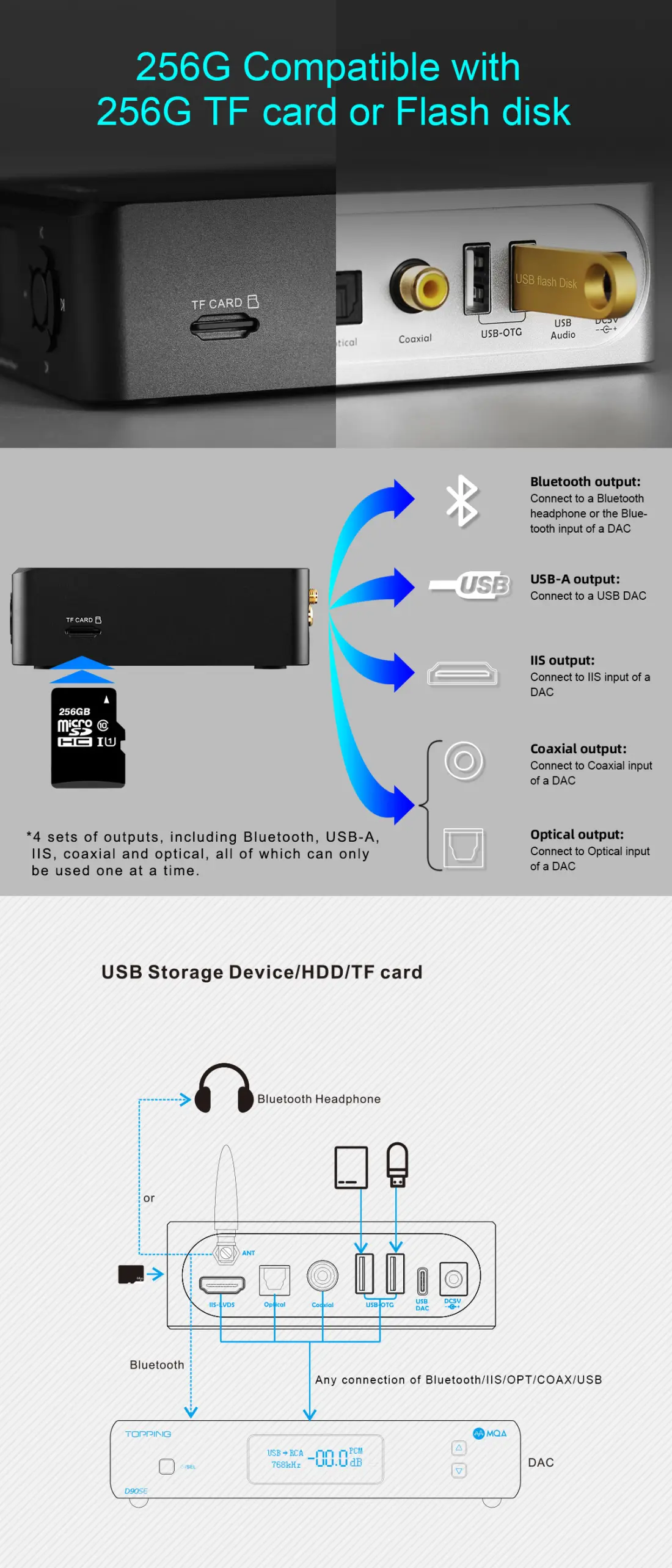 > Coaxial, Optical, IIS, USB-A digital output support.