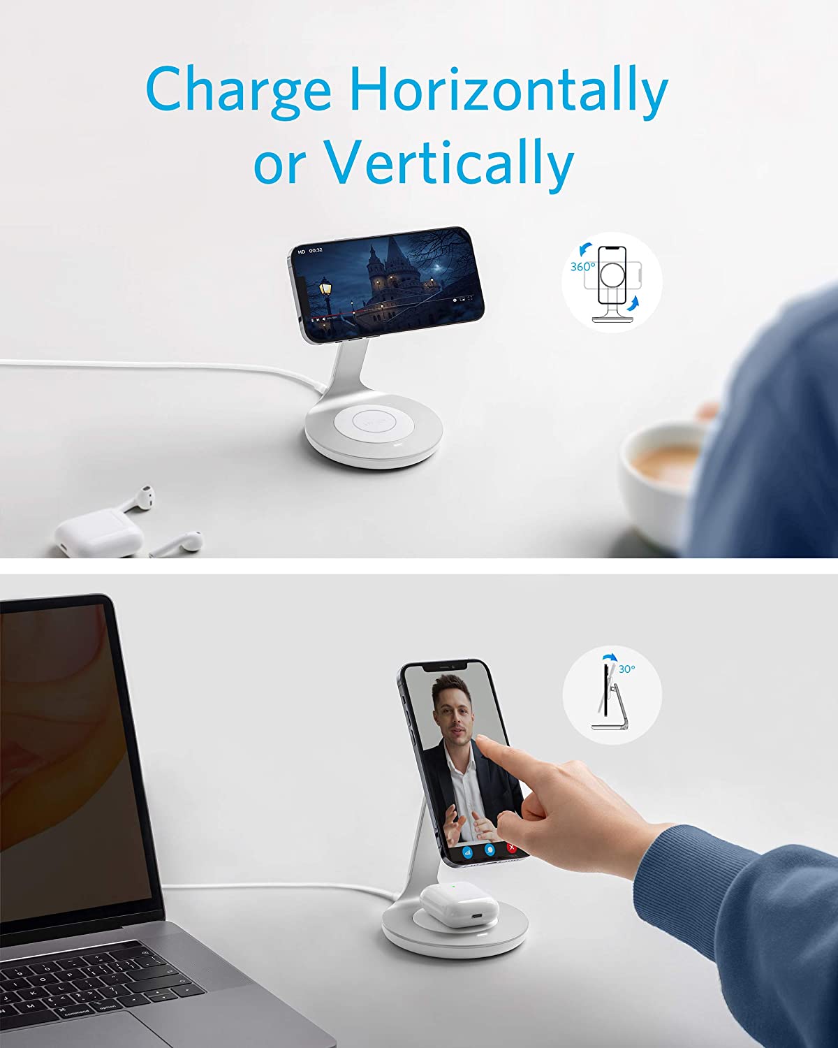 Charge your iPhone 13 on the magnetic stand surface, and use the charging pad below to power up your Qi-compatible earphones like AirPods at the same time.