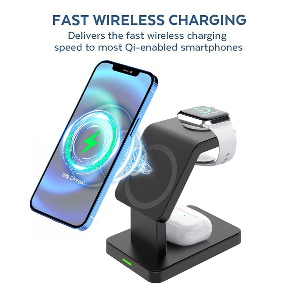 1. 【3 In 1】The magnetic three-charging bracket can simultaneously charge mobile phones, earphones and watches to solve the charging problem of multiple devices in one stop.