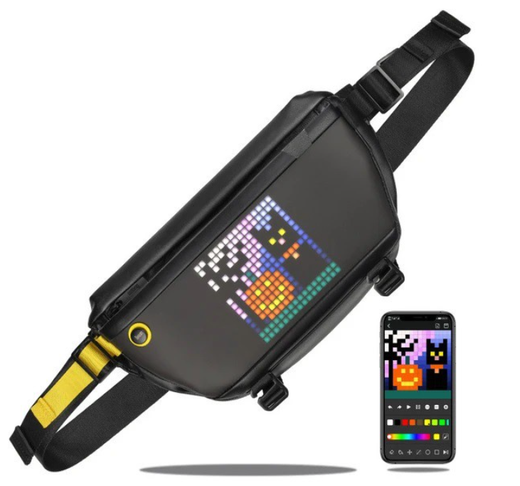 1. Four-layer storage design inside and outside 2. Waterproof (splashed raindrops)IP67 3. Connect to the APP to experience the exclusive creationPixoo-Slingbag is a stylish sling that suit your taste, yet verstile for for the urban daily life. It features a built-in LED screen and a mobile APP that lets you draw animation, display favorite logos, and communicate with others on your sling.so Sling bag is made of sturdy and durable polyester, water repellent. Lightweight, versatile, strong and sturdy rucksack. The lining is wear-resistant polyester and the colour will not fade• Create any pixel art animationeasily via the Divoom mobile application, or you can convert GIF to display. You can also type in the message and display it on your Sling Bag. Best of all, you can search your desired design from the a massive online gallery, and interact with other pixel art fans around the world.• 16x16 led screenProgrammable Pixel Art Led Display,you can Create your own pixel art, or pick a favorite one from the online gallery,also Team Logo,Memes,and Emoji,display anything you like on this stylish sling!• Pixoo sling bag is compatible with our remote controlwhere it will transform the sling into an indicator for the following traffic. You can also program different images and action to the remote buttons. Say good bye to the old school v-shape insert buckle. The manetic buckle is so easy to operate, and strong enough to hold your precioious cargos. Clip on, and clip off; you're good to go.The flexible strap of this chest bag can be adjusted,fit for normal size and plus size. A sling backpack is suitable for men, women even so cute for kids.• Lightweight Traveler & Sufficient CapacityThis Sling bag has three pockets: two at the front and one at the back. The front zipper bag can hold small objects for easy access. The main bag can hold mobile phone, wallet, charging treasure and so on. Finally, the back zipper bag is safe for mobile phone, cash and other valuables.Pixoo Sling bag offers different compartments to fit all your daily gears. Time to enjoy your journe