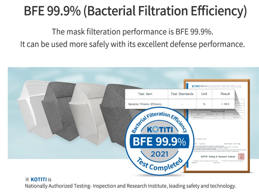 ⭐ BFE (Bacterial Filtration Efficiency) 99.9%Mask filtration performance is BFE 99.9 %. Protects from bacteria with its excellent defence performance.