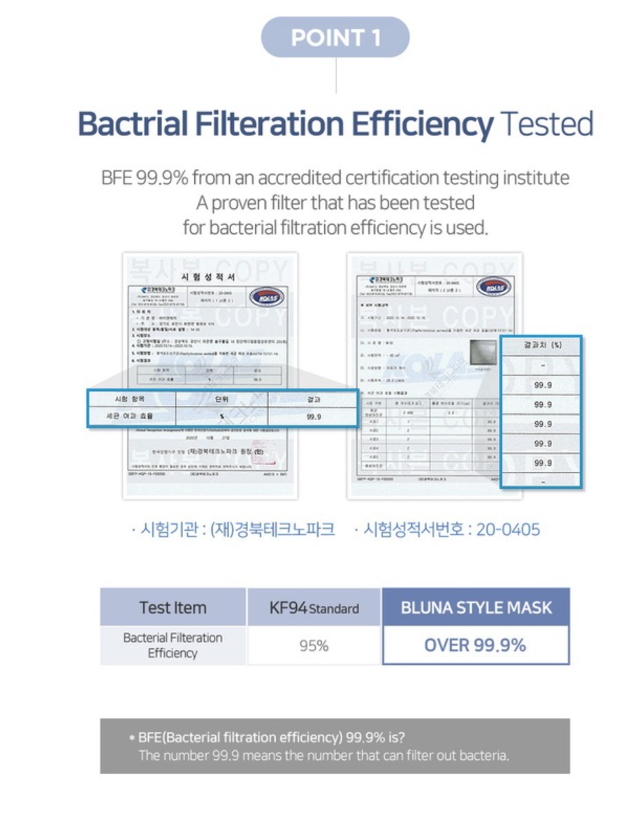 ⭐ BFE (Bacterial Filtration Efficiency) 99.9%Mask filtration performance is BFE 99.9 %. Protects from bacteria with its excellent defence performance.