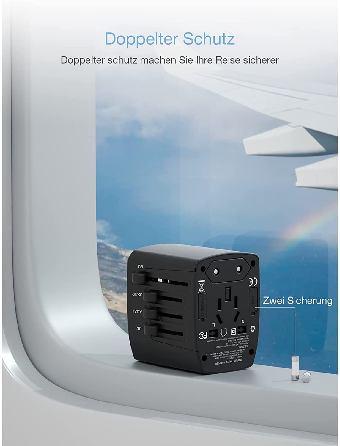 • Double fuse: socket adapter with double safety fuse (8A each), integrated safety roller blinds, smart IC for intelligent charging.