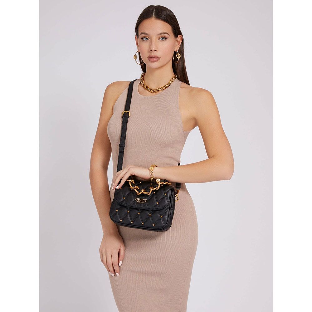 Elegant Quilt designed handbag . Top handle. Multiple compartments. Guess name Logo. Comes with charms and embelishments to make it look extremely attractive. Perfect to be carried at work & parties.