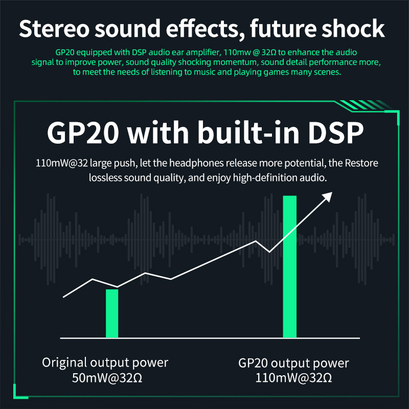 GP20 equipped with DSP audio ear amplifier, 110mw @ 320 to enhance the audio signal to improve power, sound quality shocking momentum, sound detail performance more, to meet the needs of listening to music and playing games many scenes.