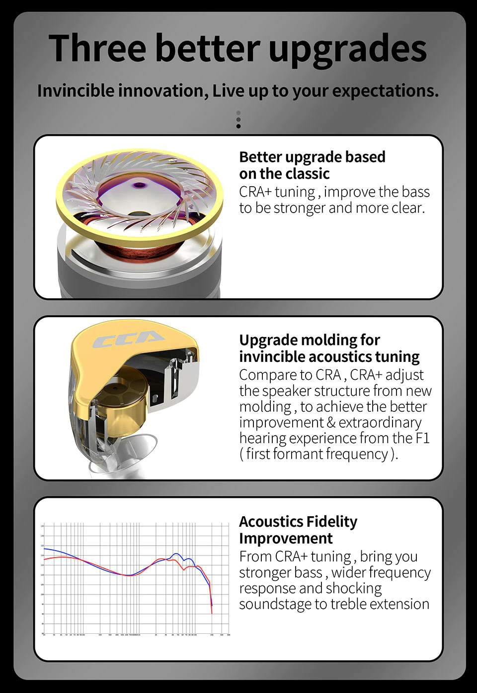The engineers at CCA have researched and improved the new CRA+ in the tuning aspect as it allows the bass to be clear and punchy. The professional acoustic tuning helps the audio quality, adjusting the driver to present an extraordinary listening experience. It brings you a rounder bass, a higher frequency response, and a wide soundstage.