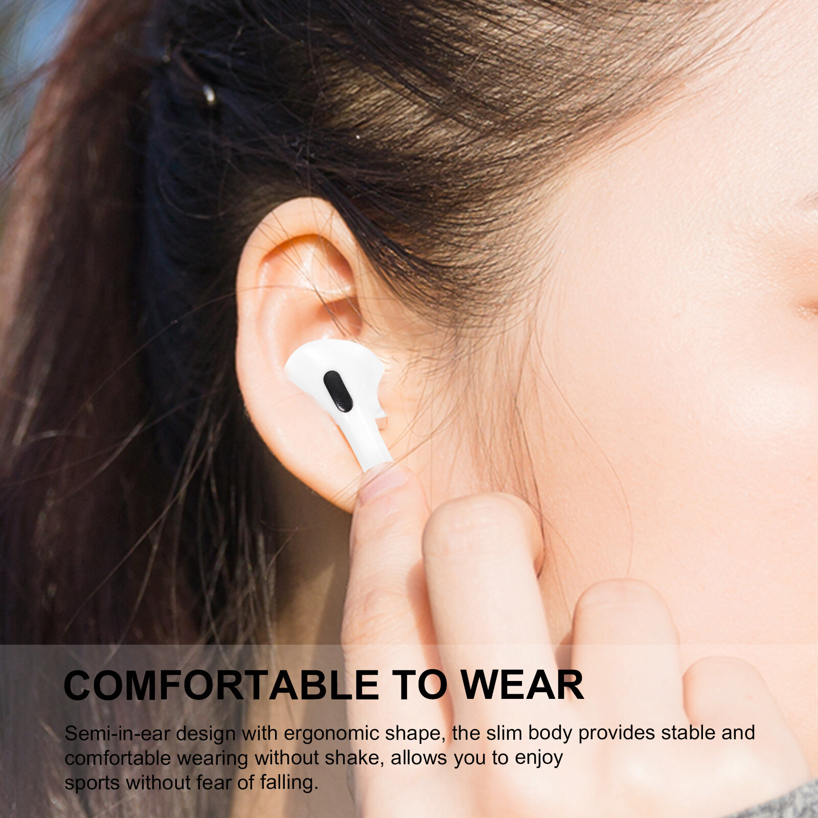 Semi-in-ear design with ergonomic shape, the slim body provides stable and comfortable wearing without shake, allows you to enjoy sports without fear of falling.